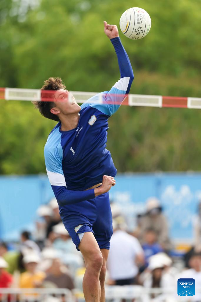 CHENGDU,11 agosto, 2025 (Xinhua) -- Andrés Gruss, de Chile, compite durante el partido del Grupo B de la ronda preliminar masculina de fistball entre Chile y Argentina en los Juegos Mundiales 2025, en Chengdu, en la provincia de Sichuan, en el suroeste de China, el 11 de agosto de 2025. (Xinhua/Wang Xiang)
