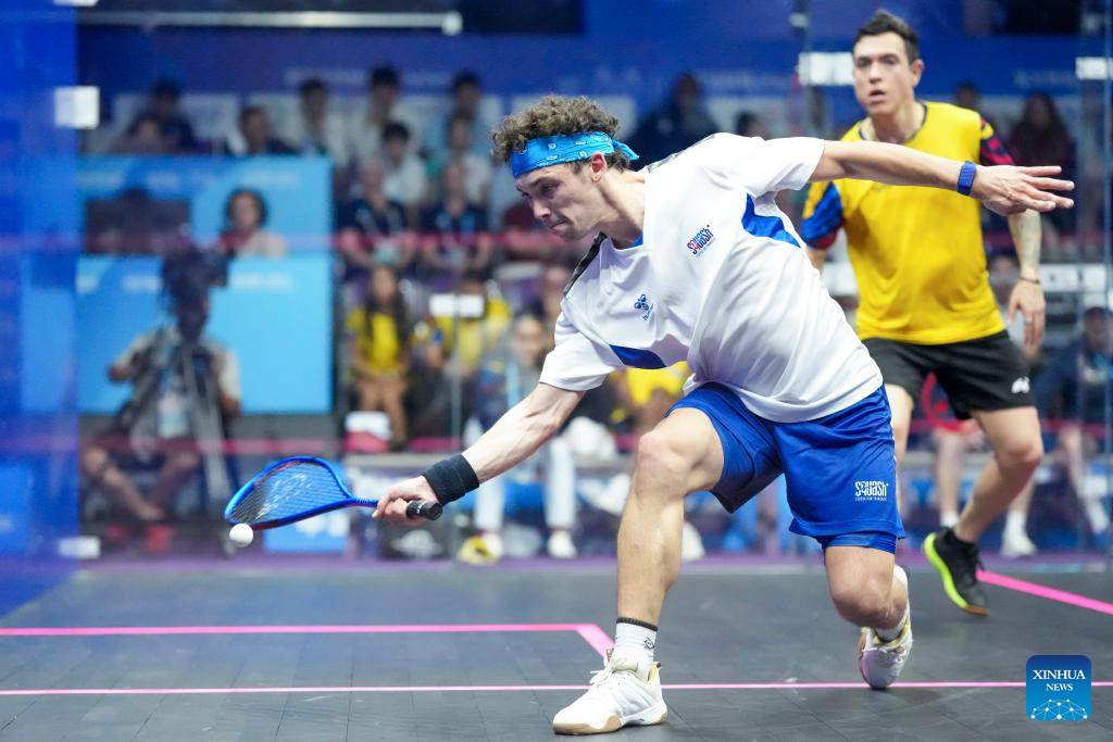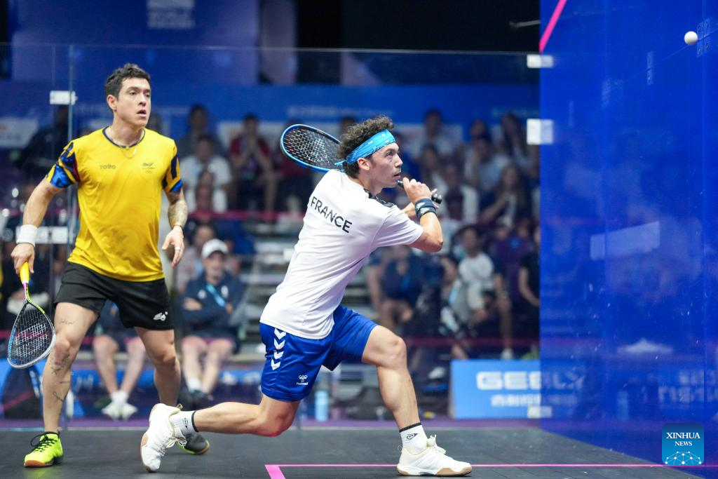 CHENGDU, 11 agosto, 2025 (Xinhua) -- Victor Crouin (d), de Francia, compite durante el partido de semifinal de individuales masculinos de Squash ante Miguel Rodríguez, de Colombia, en los Juegos Mundiales 2025, en Chengdu, en la provincia de Sichuan, en el suroeste de China, el 11 de agosto de 2025. (Xinhua/Li Xulun)