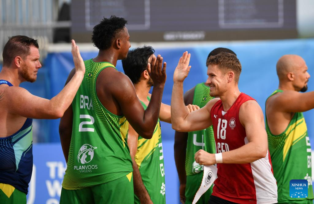 CHENGDU, 11 agosto, 2025 (Xinhua) -- Jugadores se saludan previo a la semifinal masculina entre Alemania y Brasil del evento de balonmano de playa en los Juegos Mundiales 2025, en Chengdu, en la provincia de Sichuan, en el suroeste de China, el 11 de agosto de 2025. (Xinhua/Zhang Bowen)