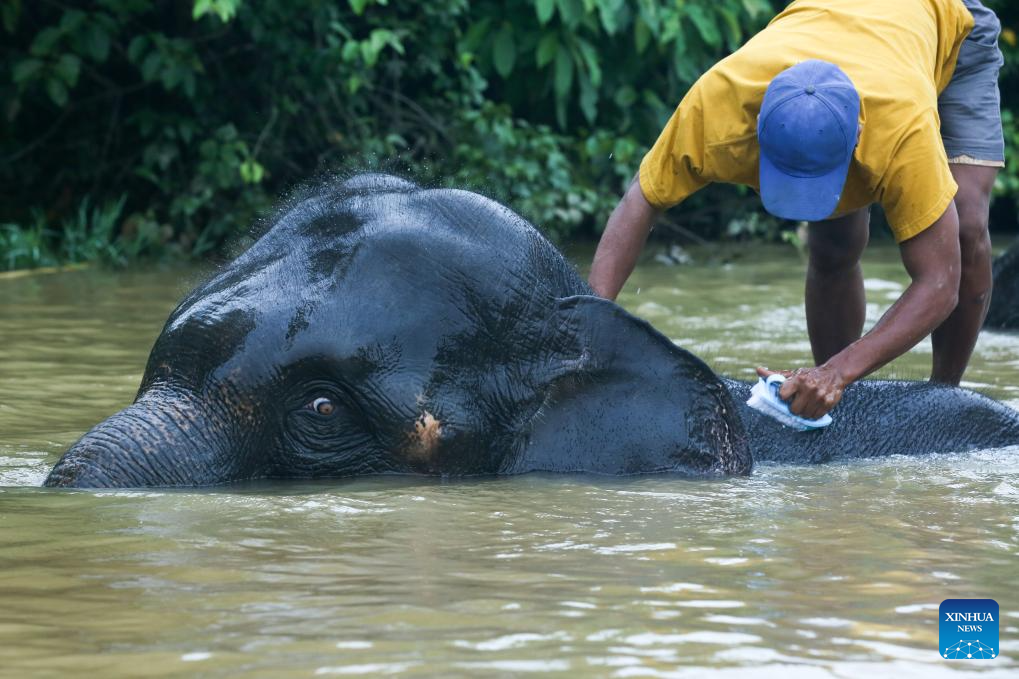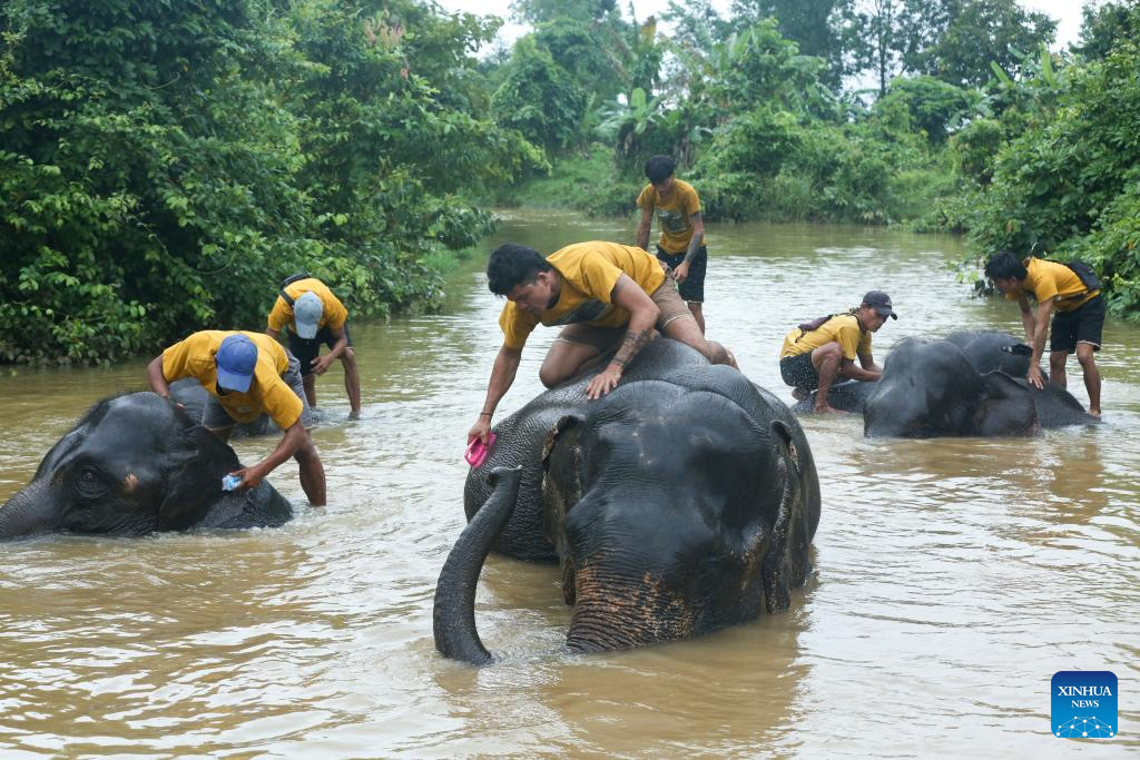 BAGO, 12 agosto, 2025 (Xinhua) -- Cuidadores ayudan a los elefantes a bañarse en el campamento de elefantes Wingabaw, en la región de Bago, Myanmar, el 12 de agosto de 2025. El Día Mundial del Elefante se celebra cada año el 12 de agosto. (Xinhua/Myo Kyaw Soe)
