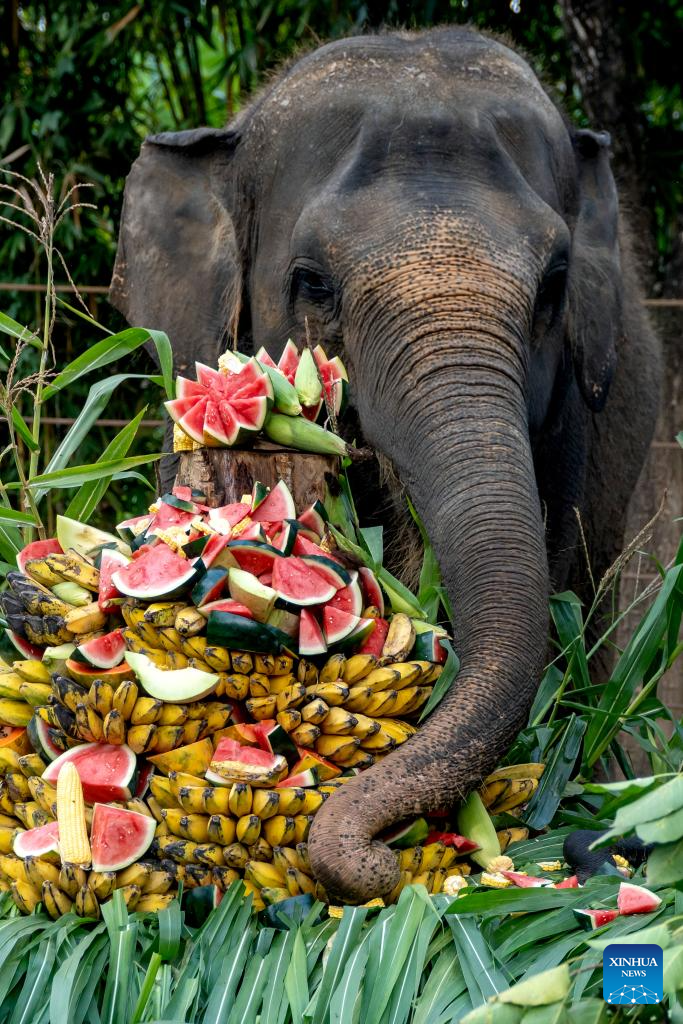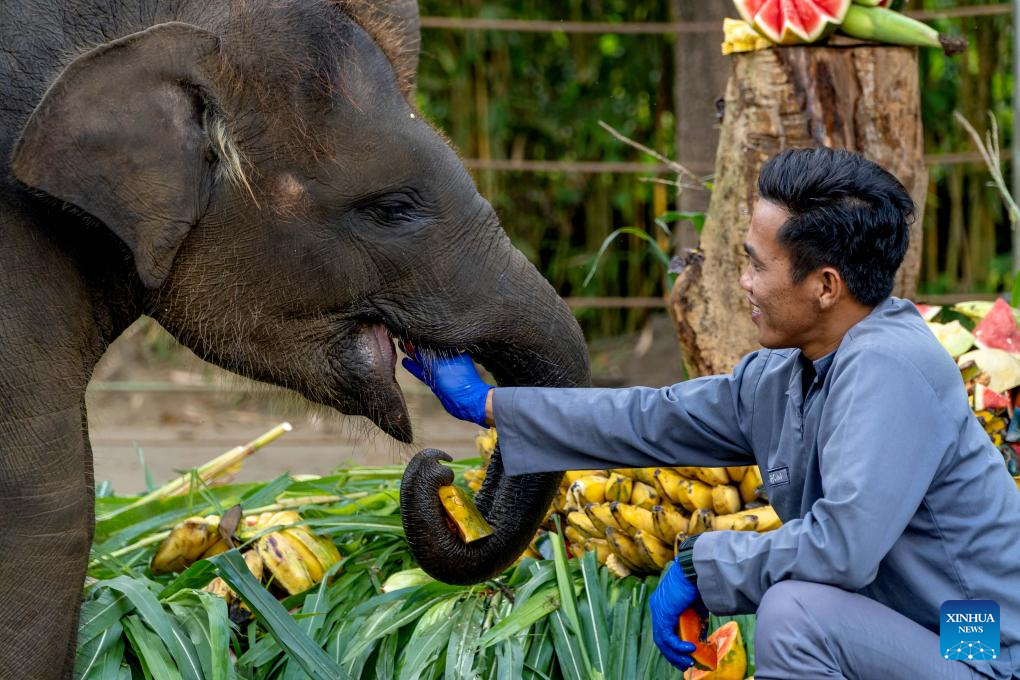 BALI, 12 agosto, 2025 (Xinhua) -- Un elefante de Sumatra come fruta durante la conmemoración del Día Mundial del Elefante, en el Centro de Conservación del Zoológico de Bali, en la regencia de Gianyar, en Bali, Indonesia, el 12 de agosto de 2025. El Día Mundial del Elefante se celebra cada año el 12 de agosto. (Xinhua/Dicky Bisinglasi)