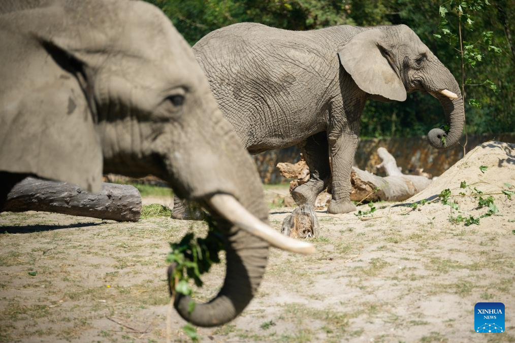 VARSOVIA, 12 agosto, 2025 (Xinhua) -- Elefantes se alimentan en el Zoológico de Varsovia, en Varsovia, Polonia, el 12 de agosto de 2025. La casa de los elefantes del zoológico organizó actividades especiales el martes para conmemorar el Día Mundial del Elefante. (Xinhua/Jaap Arriens)