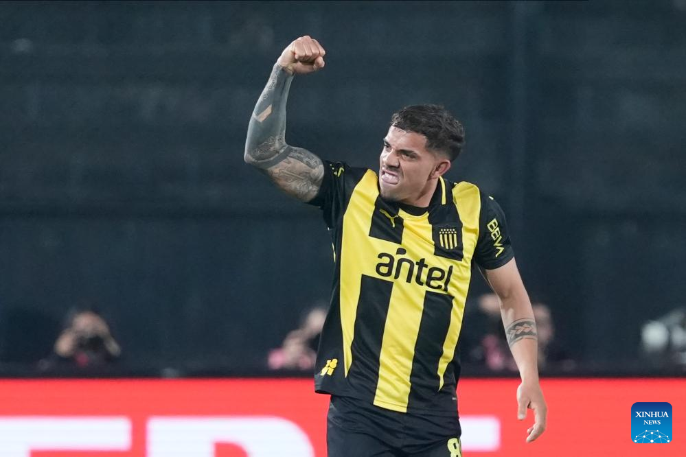 Imagen del 12 de agosto de 2025 del jugador David Terans, de Peñarol de Uruguay, festejando su anotación, durante el partido de ida correspondiente a los octavos de final de la Copa Conmebol Libertadores ante Racing de Argentina, celebrado en el Estadio Campeón del Siglo, en Montevideo, capital de Uruguay. (Xinhua/Nicolás Celaya)