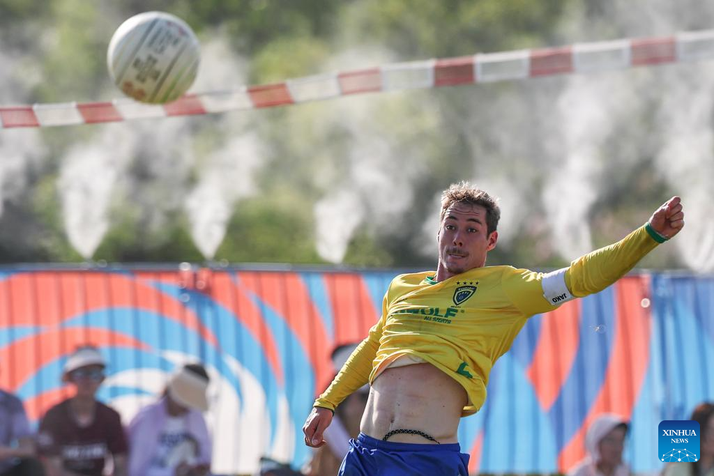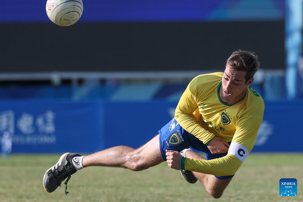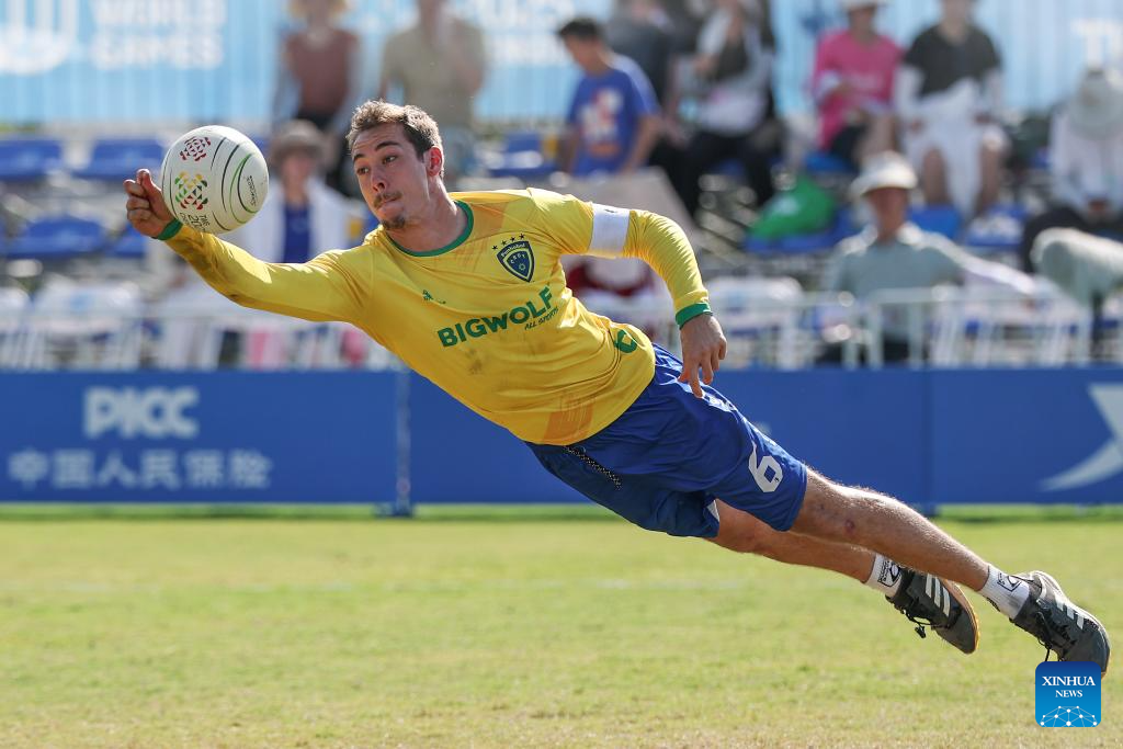 CHENGDU, 12 agosto, 2025 (Xinhua) -- Gabriel Petry Heck, de Brasil, compite durante el partido de semifinal masculina de fistball entre Brasil y Suiza en los Juegos Mundiales 2025, en Chengdu, en la provincia de Sichuan, en el suroeste de China, el 12 de agosto de 2025. (Xinhua/Chen Cheng)