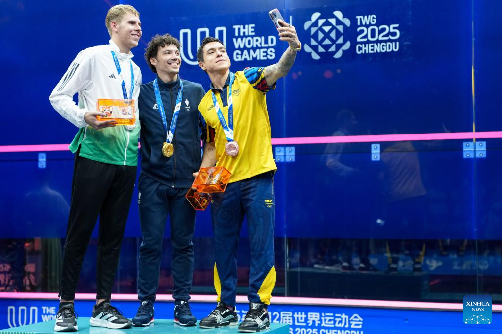 CHENGDU, 12 agosto, 2025 (Xinhua) -- El medallista de oro Victor Crouin (c), de Francia, el medallista de plata Balazs Farkas (i), de Hungría, y el medallista de bronce Miguel Rodríguez, de Colombia, se toman una fotografía al término de la ceremonia de premiación del partido de individuales masculinos del evento de squash en los Juegos Mundiales 2025, en Chengdu, en la provincia de Sichuan, en el suroeste de China, el 12 de agosto de 2025. (Xinhua/Li Xulun)