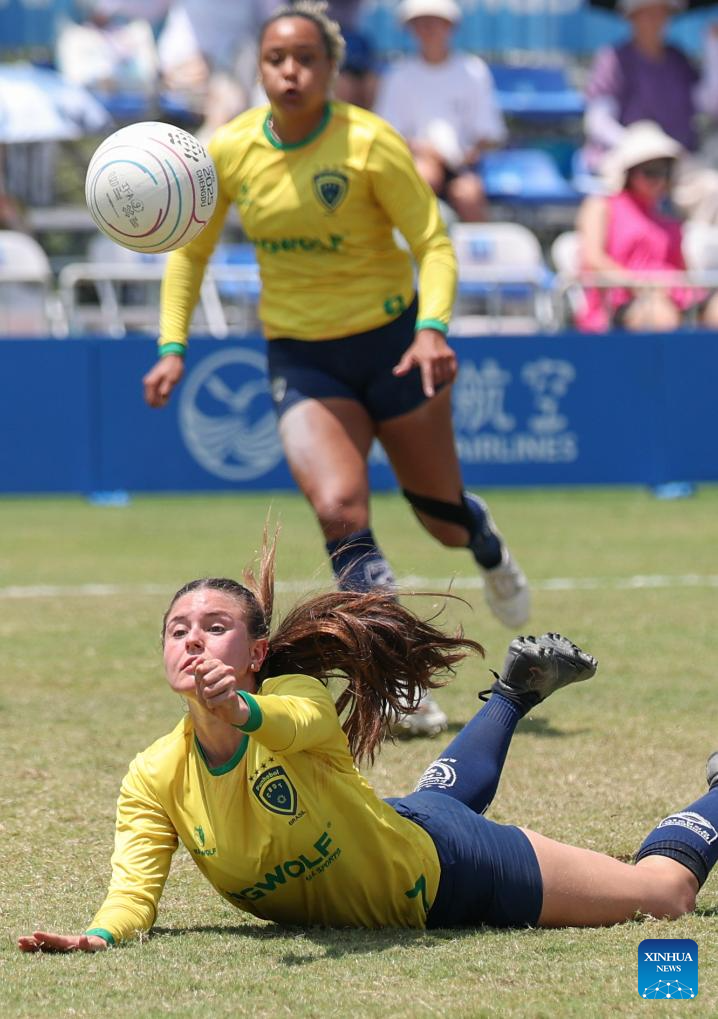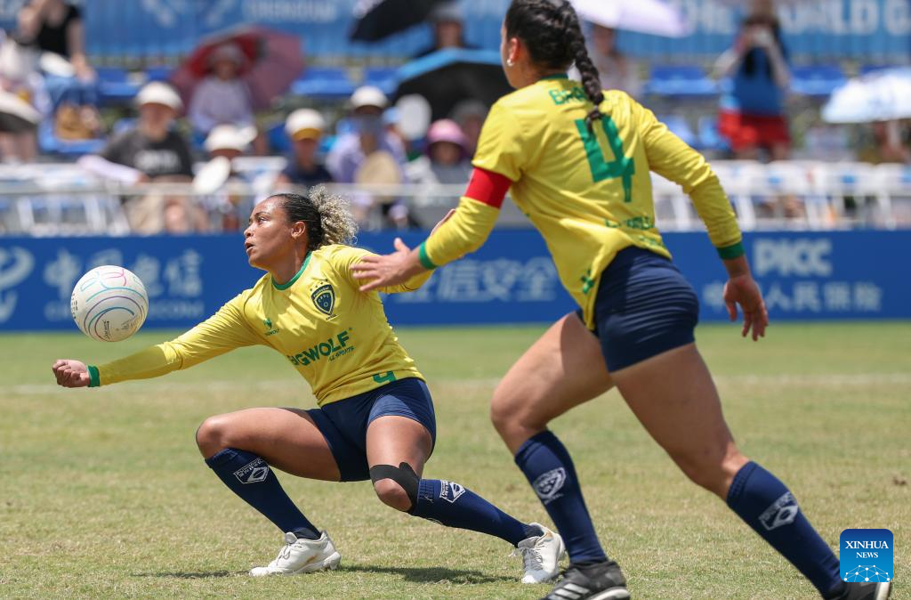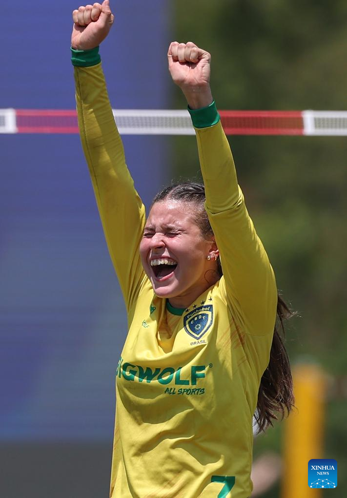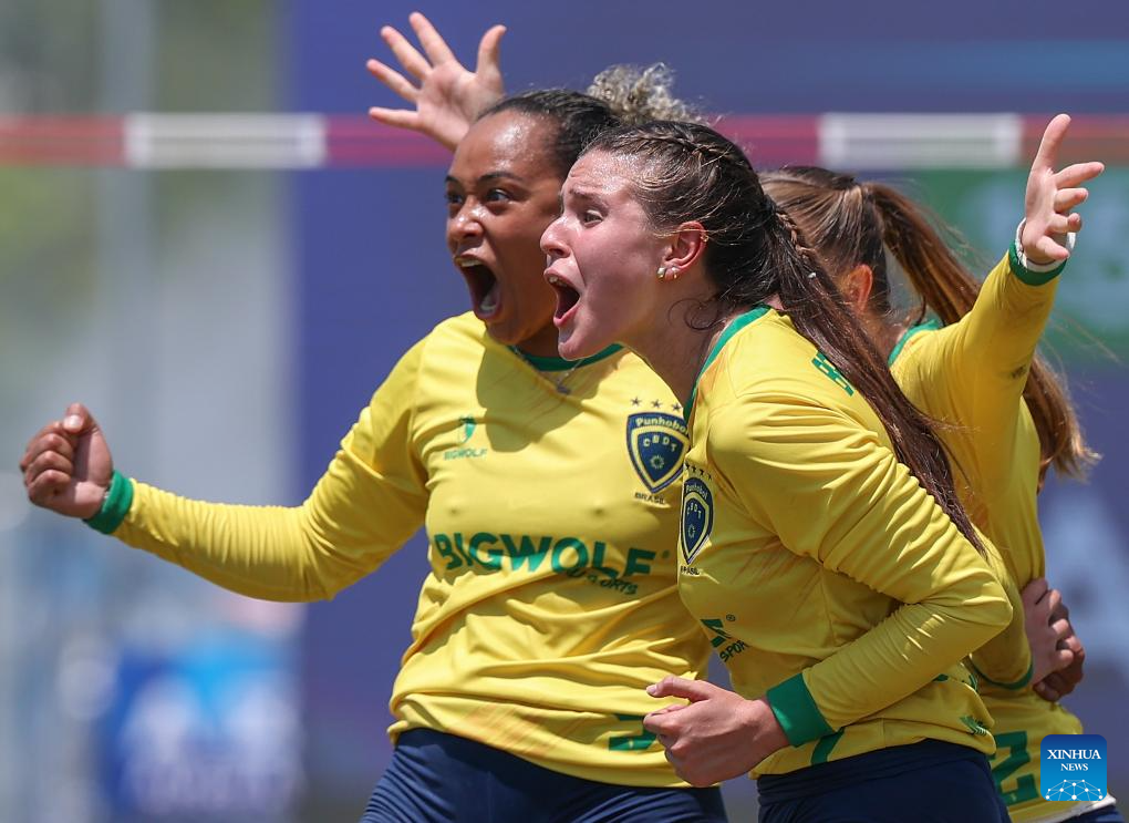 CHENGDU, 12 agosto, 2025 (Xinhua) -- Jugadoras de Brasil festejan durante el partido de semifinal femenina de fistball entre Brasil y Austria en los Juegos Mundiales 2025, en Chengdu, en la provincia de Sichuan, en el suroeste de China, el 12 de agosto de 2025. (Xinhua/Chen Cheng)