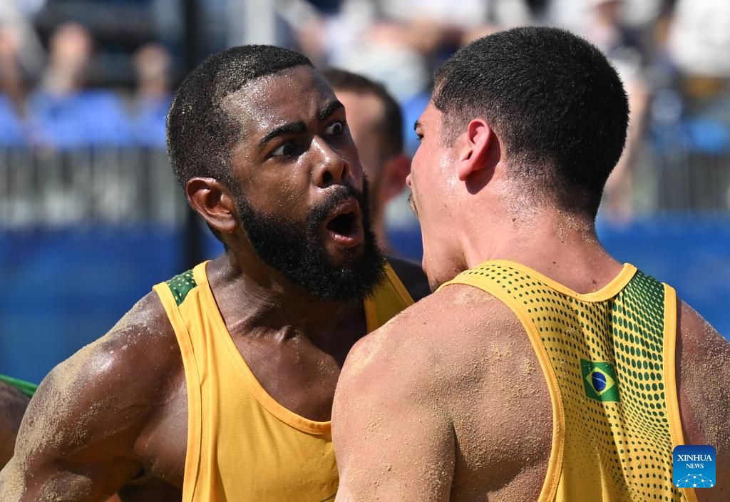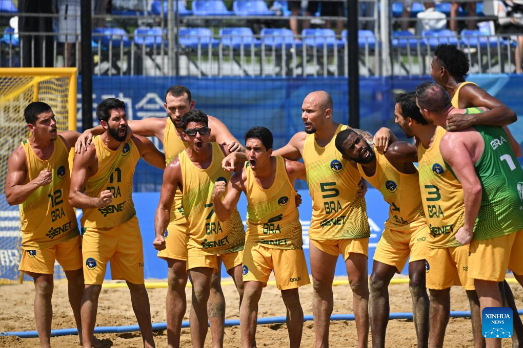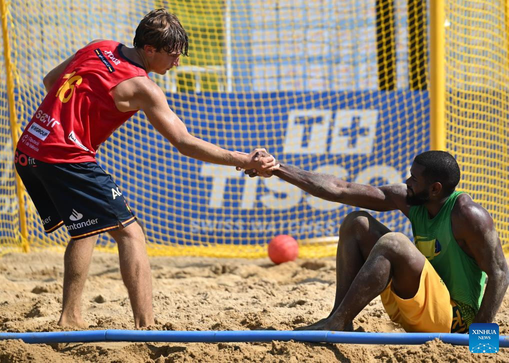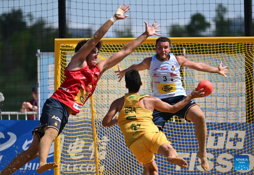 CHENGDU, 12 agosto, 2025 (Xinhua) -- Renan Carvalho (d), de Brasil, compite durante el partido por la medalla de bronce de las finales masculinas entre España y Brasil del evento de balonmano de playa en los Juegos Mundiales 2025, en Chengdu, en la provincia de Sichuan, en el suroeste de China, el 12 de agosto de 2025. (Xinhua/Chen Zhenhai)
