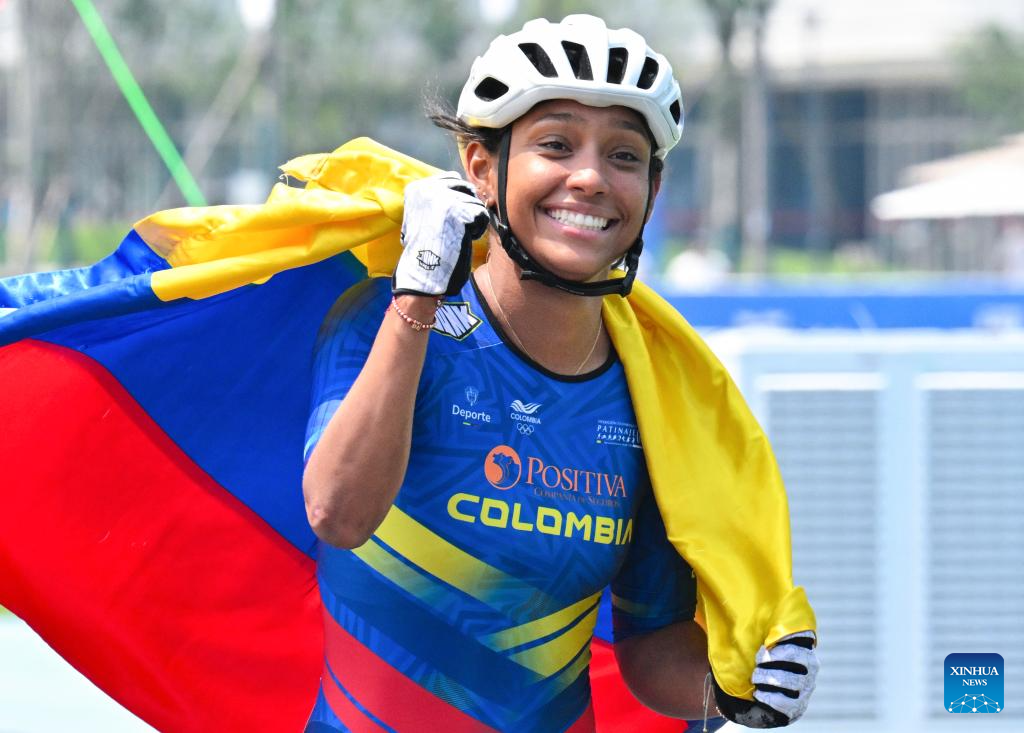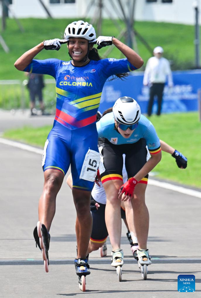 CHENGDU, 12 agosto, 2025 (Xinhua) -- María Fernanda Timms Ariza, de Colombia, festeja después de ganar la final A de1 vuelta femenina del evento de patinaje de velocidad en línea en ruta en los Juegos Mundiales 2025, en Chengdu, en la provincia de Sichuan, en el suroeste de China, el 12 de agosto de 2025. (Xinhua/Xie Jianfei)