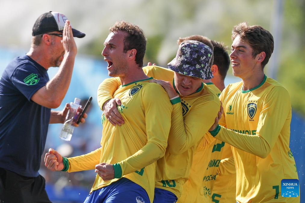 CHENGDU, 12 agosto, 2025 (Xinhua) -- Jugadores de Brasil festejan durante el partido de semifinal masculina de fistball entre Brasil y Suiza en los Juegos Mundiales 2025, en Chengdu, en la provincia de Sichuan, en el suroeste de China, el 12 de agosto de 2025. (Xinhua/Chen Cheng)