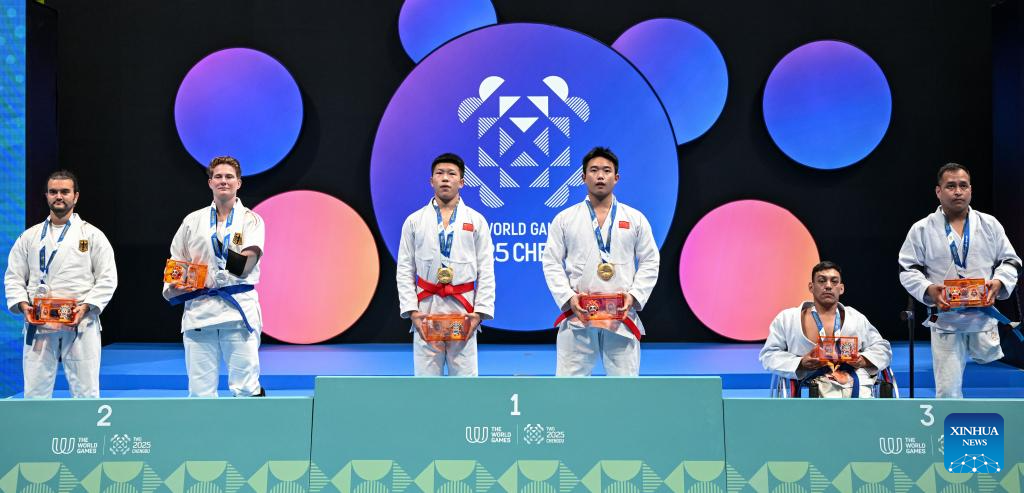 CHENGDU, 12 agosto, 2025 (Xinhua) -- Los medallistas de oro, Li Yucai (3-d)/Guo Ao (3-i) de China, los medallistas de plata, Alessandro Schober (i)/Christine Jahn (2-i), de Alemania, y los medallistas de bronce, Manuel Alberto Cisneros de los Santos (2-d)/José Gilberto Moreno Aguila, de México, posan durante la ceremonia de premiación de dúo mixto parafísico del evento de Jiu-Jitsu en los Juegos Mundiales 2025, en Chengdu, en la provincia de Sichuan, en el suroeste de China, el 12 de agosto de 2025. (Xinhua/Feng Kaihua)