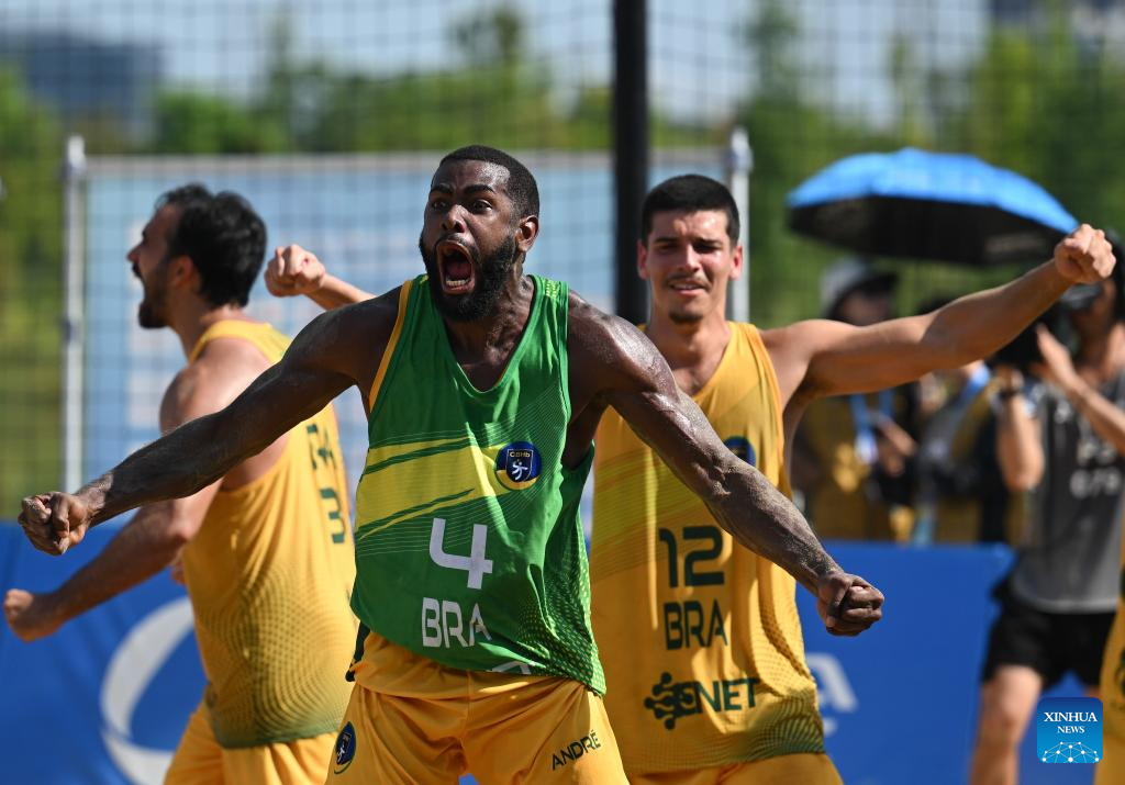 CHENGDU, 12 agosto, 2025 (Xinhua) -- Andre de Oliveira (c), de Brasil, festeja al término del partido por la medalla de bronce de las finales masculinas entre España y Brasil del evento de balonmano de playa en los Juegos Mundiales 2025, en Chengdu, en la provincia de Sichuan, en el suroeste de China, el 12 de agosto de 2025. (Xinhua/Chen Zhenhai)