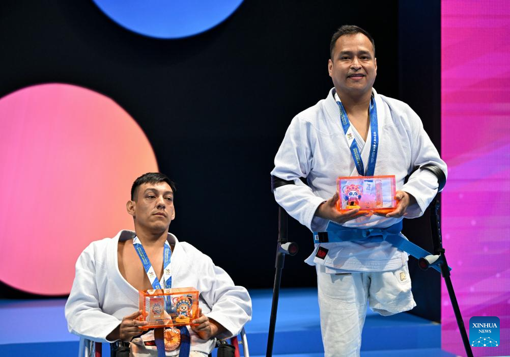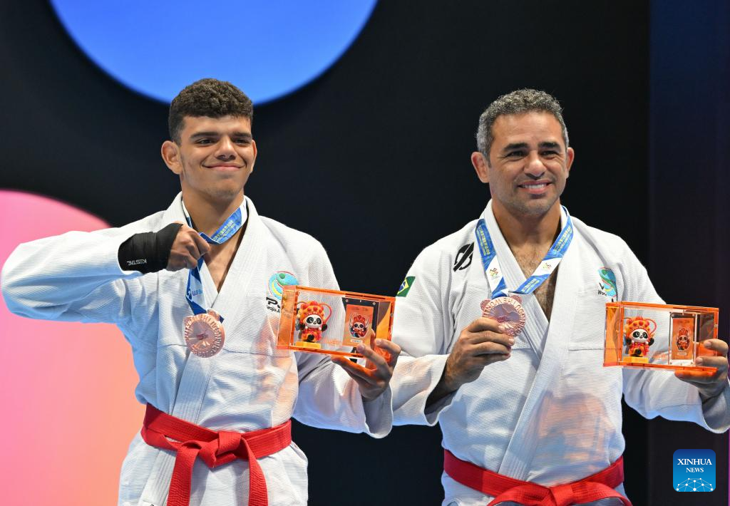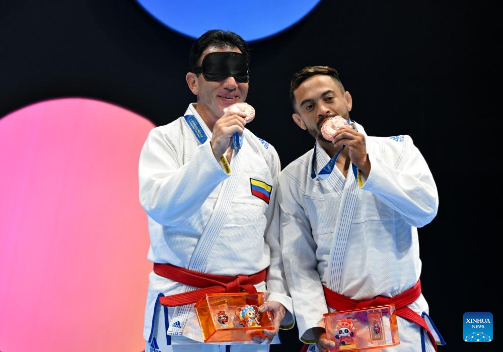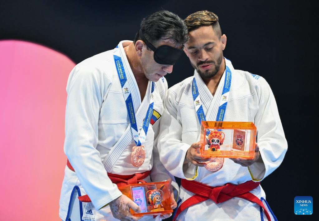 CHENGDU, 12 agosto, 2025 (Xinhua) -- Los medallistas de bronce, Marcus Madruga (i)/Mario Edson Oliveira Silva, de Brasil, posan durante la ceremonia de premiación de dúo mixto paramental del evento de Jiu-Jitsu, en los Juegos Mundiales 2025, en Chengdu, en la provincia de Sichuan, en el suroeste de China, el 12 de agosto de 2025. (Xinhua/Feng Kaihua)