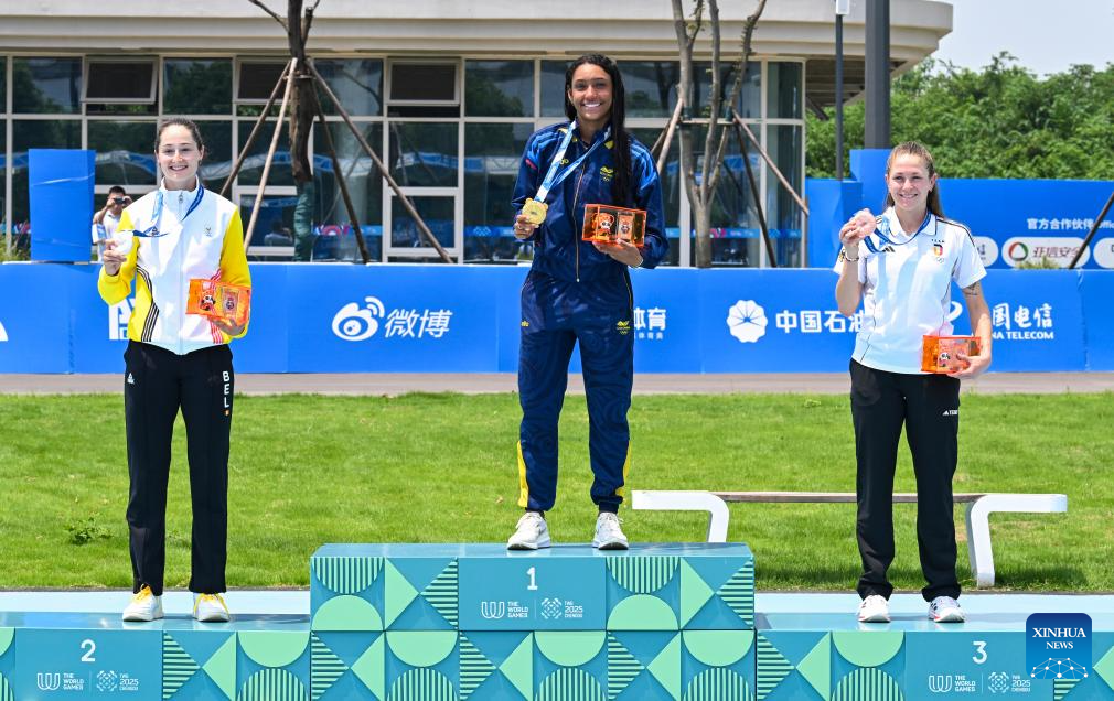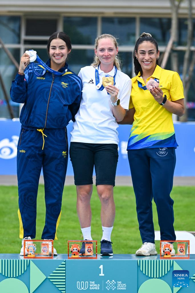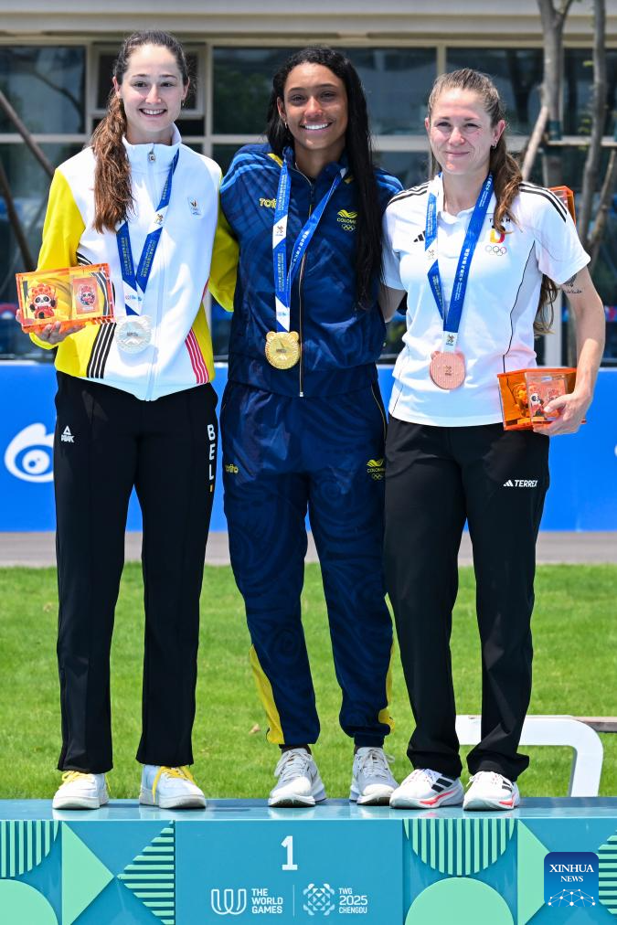 CHENGDU, 12 agosto, 2025 (Xinhua) -- La medallista de oro María Fernanda Timms Ariza (c), de Colombia, la medallista de plata Fran Vanhoutte (i), de Bélgica, y la medallista de bronce Anna-Laethisia Schimek, de Alemania, posan durante la ceremonia de premiación de 1 vuelta femenina del evento de patinaje de velocidad en línea en ruta en los Juegos Mundiales 2025, en Chengdu, en la provincia de Sichuan, en el suroeste de China, el 12 de agosto de 2025. (Xinhua/Xie Jianfei)