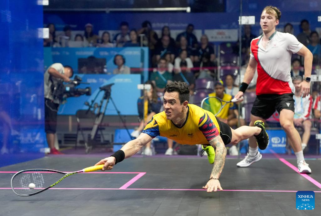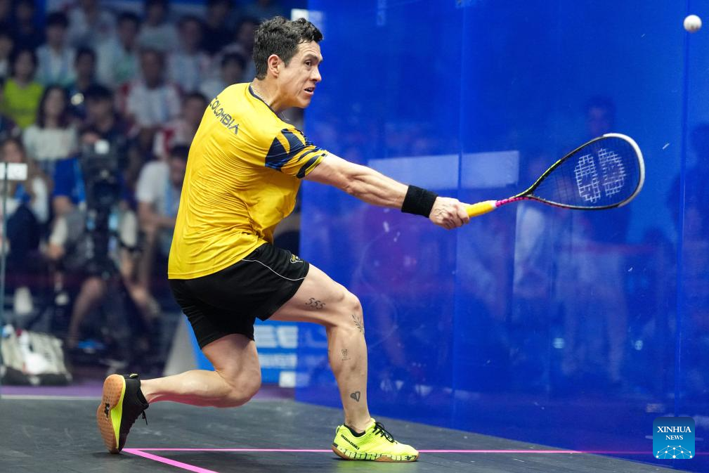 CHENGDU, 12 agosto, 2025 (Xinhua) -- Miguel Rodríguez compite durante el partido por la medalla de bronce de las finales individuales masculinos entre Miguel Rodríguez, de Colombia, y Dimitri Steinmann, de Suiza, del evento de squash de los Juegos Mundiales 2025, en Chengdu, en la provincia de Sichuan, en el suroeste de China, el 12 de agosto de 2025. (Xinhua/Li Xulun)