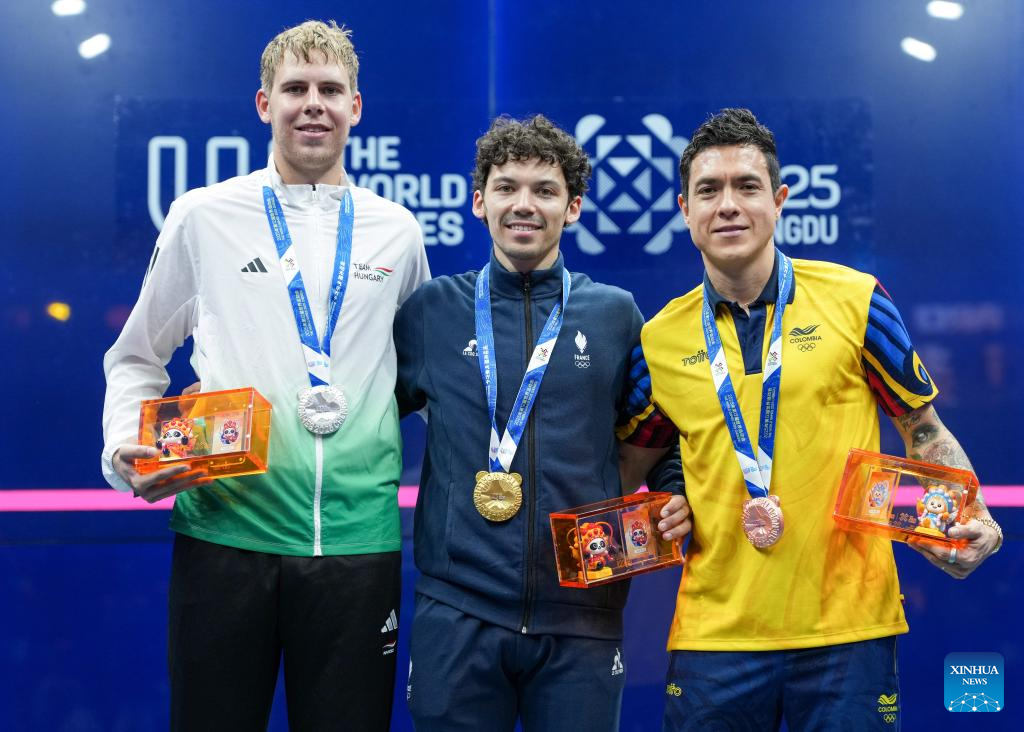 CHENGDU, 12 agosto, 2025 (Xinhua) -- El medallista de oro Victor Crouin (c), de Francia, el medallista de plata Balazs Farkas (i), de Hungría, y el medallista de bronce Miguel Rodríguez, de Colombia, posan durante la ceremonia de premiación del partido por la medalla de oro de las finales individuales masculinas del evento de squash en los Juegos Mundiales 2025, en Chengdu, en la provincia de Sichuan, en el suroeste de China, el 12 de agosto de 2025. (Xinhua/Li Xulun)