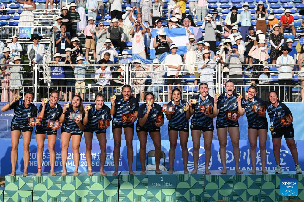 CHENGDU, 12 agosto, 2025 (Xinhua) -- Jugadoras de Argentina festejan con sus medallas de oro durante la ceremonia de premiación del evento de balonmano de playa femenino en los Juegos Mundiales 2025, en Chengdu, en la provincia de Sichuan, en el suroeste de China, el 12 de agosto de 2025. (Xinhua/Chen Zhenhai)