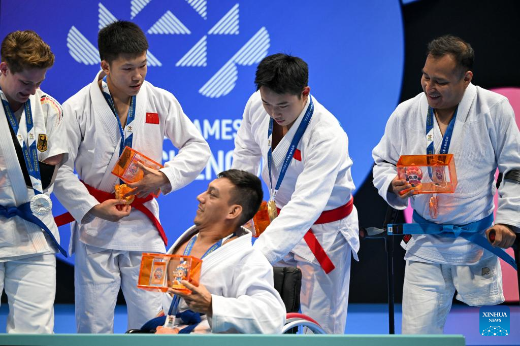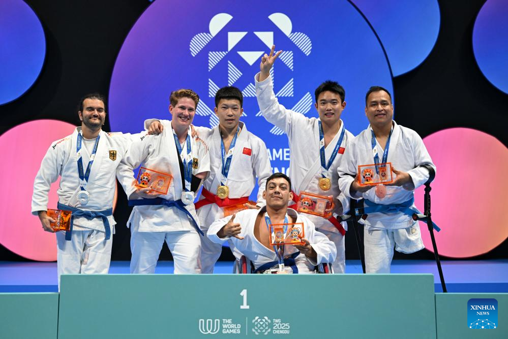 CHENGDU, 12 agosto, 2025 (Xinhua) -- El medallista de oro, Li Yucai (2-d), de China, ayuda al medallista de bronce, Manuel Alberto Cisneros de los Santos (c), de México, a mover la silla de ruedas para tomarse fotos durante la ceremonia de premiación de dúo mixto parafísico del evento de Jiu-Jitsu en los Juegos Mundiales 2025, en Chengdu, en la provincia de Sichuan, en el suroeste de China, el 12 de agosto de 2025. (Xinhua/Feng Kaihua)