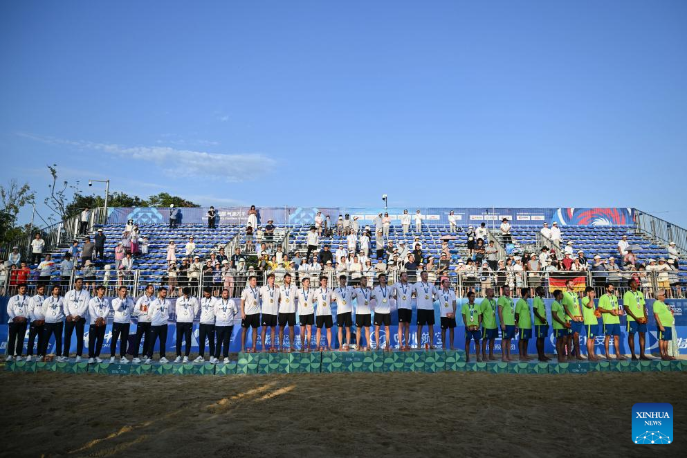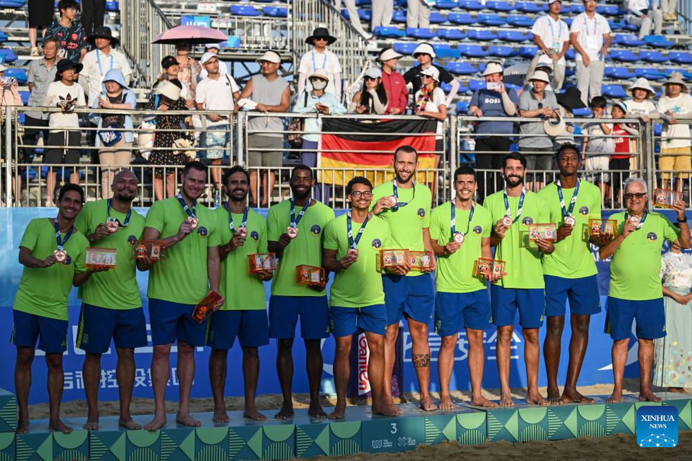 CHENGDU, 12 agosto, 2025 (Xinhua) -- Los medallistas de bronce, el equipo de Brasil, reaccionan durante la ceremonia de premiación de las finales masculinas del evento de balonmano de playa en los Juegos Mundiales 2025, en Chengdu, en la provincia de Sichuan, en el suroeste de China, el 12 de agosto de 2025. (Xinhua/Chen Zhenhai)