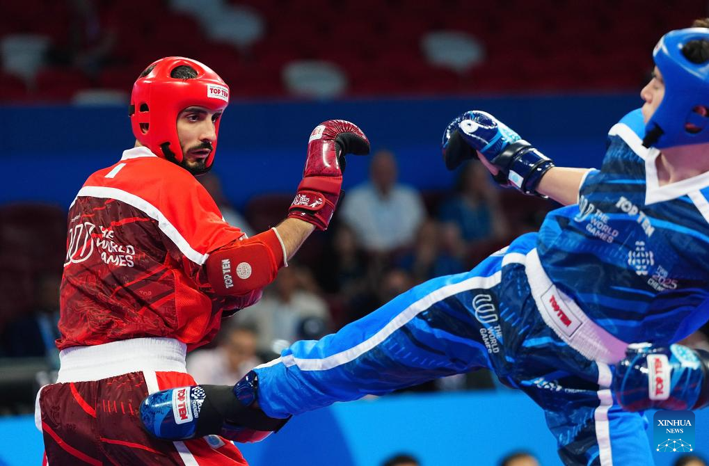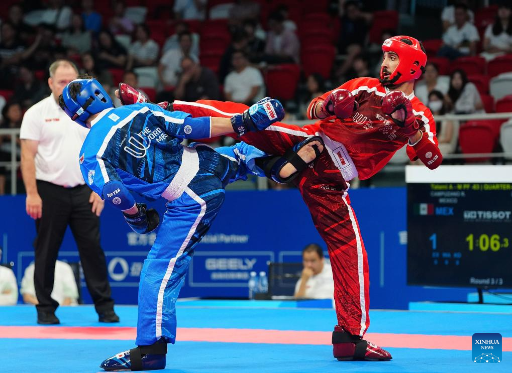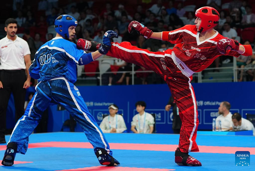 CHENGDU, 12 agosto, 2025 (Xinhua) -- Gabriele Lanzilao (i), de Italia, compite ante Raúl Campuzano, de México, durante el combate de cuartos de final masculinos por puntos -63 kg de kickboxing en los Juegos Mundiales 2025, en Chengdu, en la provincia de Sichuan, en el suroeste de China, el 12 de agosto de 2025. (Xinhua/Chen Xinbo)