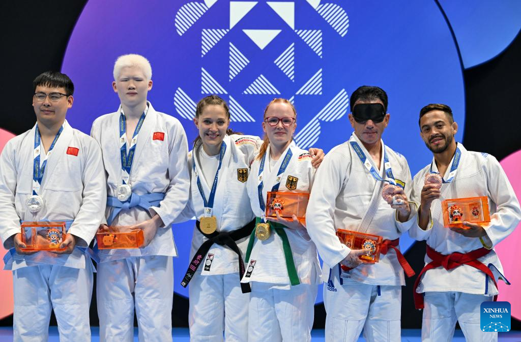 CHENGDU, 12 agosto, 2025 (Xinhua) -- Las medallistas de oro, Nike Hunecke (3-d)/Julia Paszkiewicz (3-i) de Alemania, los medallistas de plata, Pan Tianyou (2-i)/Wang Wenqiang (i) de China, y los medallistas de bronce, Jeison Camilo Mora (d)/Edgar Mauricio Castillo Villamarin, de Colombia, posan durante la ceremonia de premiación del dúo mixto paravisual del evento de Jiu-Jitsu, en los Juegos Mundiales 2025, en Chengdu, en la provincia de Sichuan, en el suroeste de China, el 12 de agosto de 2025. (Xinhua/Feng Kaihua)