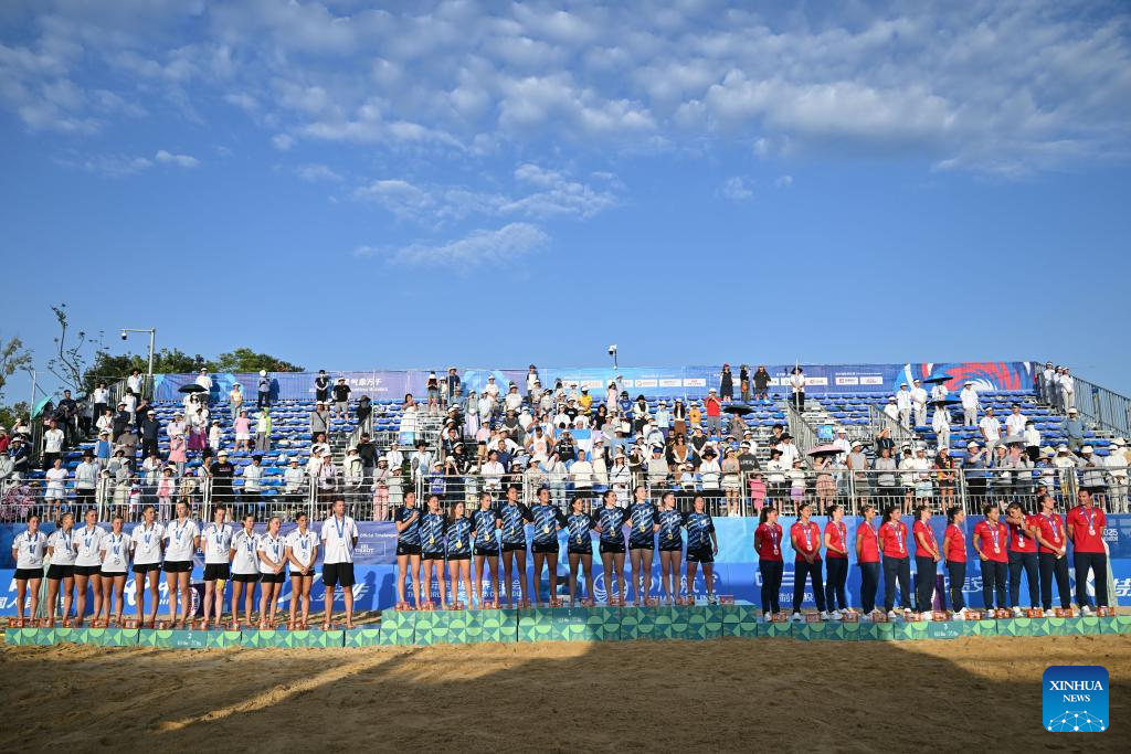 CHENGDU, 12 agosto, 2025 (Xinhua) -- El equipo de Argentina posa durante la ceremonia de premiación del evento de balonmano de playa femenino en los Juegos Mundiales 2025, en Chengdu, en la provincia de Sichuan, en el suroeste de China, el 12 de agosto de 2025. (Xinhua/Chen Zhenhai)
