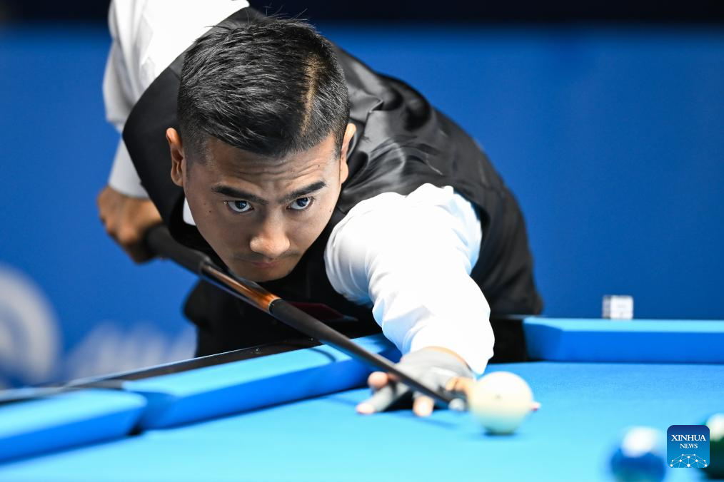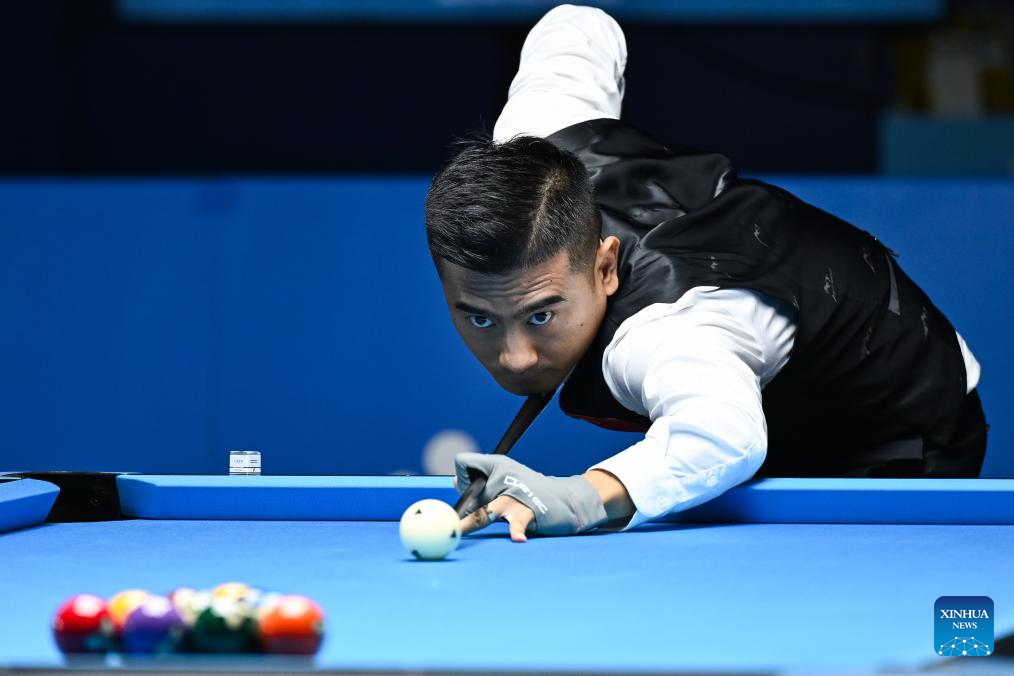CHENGDU, 12 agosto, 2025 (Xinhua) -- Dang Jinhu, de China, compite durante el partido de cuartos de final de pool masculino de billar entre Gerson Martínez, de Perú, y Dang Jinhu, de China, en los Juegos Mundiales 2025, en Chengdu, en la provincia de Sichuan, en el suroeste de China, el 12 de agosto de 2025. (Xinhua/Du Zixuan)