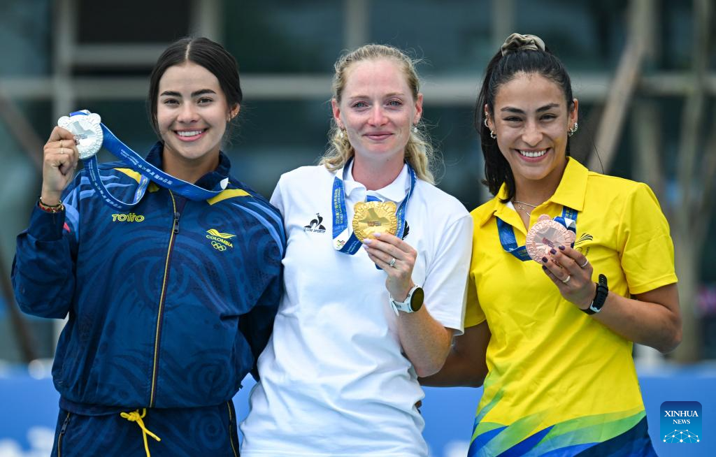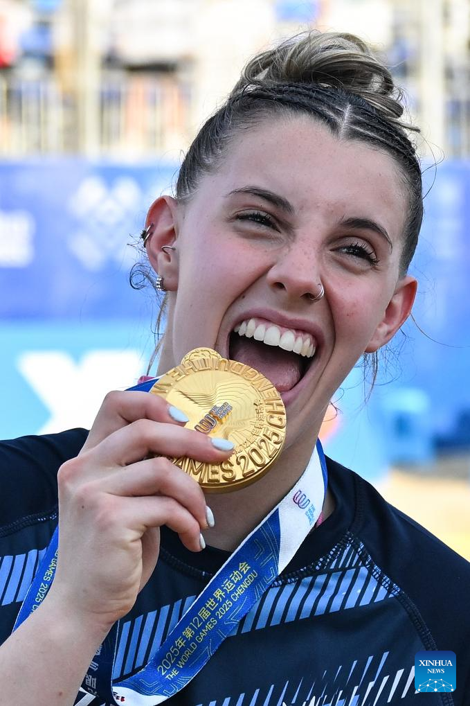 CHENGDU, 12 agosto, 2025 (Xinhua) -- La medallista de bronce Sara Banchoff Tzancoff, de Argentina, posa durante la ceremonia de premiación de la final de velocidad femenina del evento de parkour en los Juegos Mundiales 2025, en Chengdu, en la provincia de Sichuan, en el suroeste de China, el 12 de agosto de 2025. (Xinhua/Wang Xiang)
