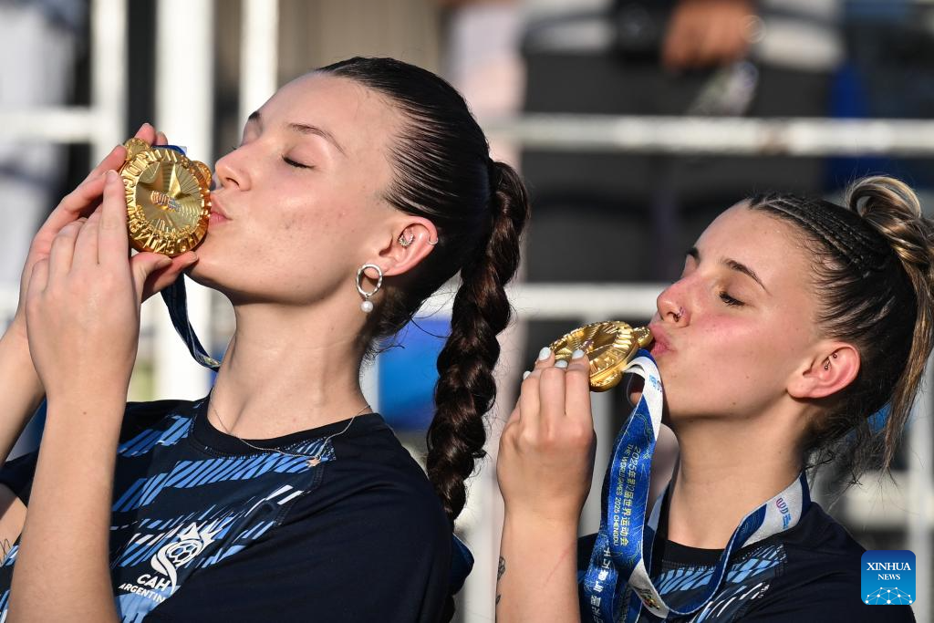 CHENGDU, 12 agosto, 2025 (Xinhua) -- Una jugadora de Argentina festeja con su medalla de oro durante la ceremonia de premiación del evento de balonmano de playa femenino en los Juegos Mundiales 2025, en Chengdu, en la provincia de Sichuan, en el suroeste de China, el 12 de agosto de 2025. (Xinhua/Chen Zhenhai)