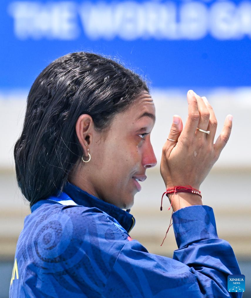 CHENGDU, 12 agosto, 2025 (Xinhua) -- La medallista de oro María Fernanda Timms Ariza, de Colombia, reacciona durante la ceremonia de premiación de 1 vuelta femenina del evento de patinaje de velocidad en línea en ruta en los Juegos Mundiales 2025, en Chengdu, en la provincia de Sichuan, en el suroeste de China, el 12 de agosto de 2025. (Xinhua/Xie Jianfei)