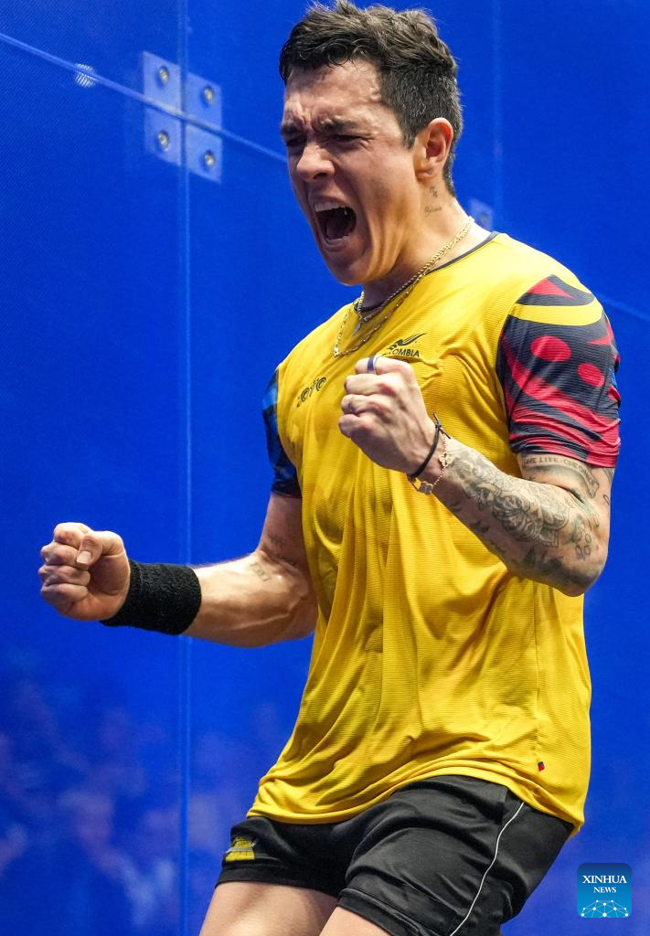 CHENGDU, 12 agosto, 2025 (Xinhua) -- Miguel Rodríguez festeja al término del partido por la medalla de bronce de las finales individuales masculinos entre Miguel Rodríguez, de Colombia, y Dimitri Steinmann, de Suiza, del evento de squash de los Juegos Mundiales 2025, en Chengdu, en la provincia de Sichuan, en el suroeste de China, el 12 de agosto de 2025. (Xinhua/Li Xulun)