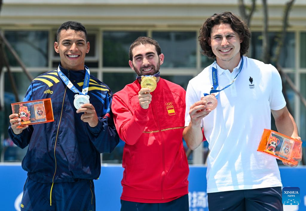 CHENGDU, 12 agosto, 2025 (Xinhua) -- El medallista de oro Jhoan Sebastián Guzmán Bitar (c), de España, el medallista de plata Jhon Edwar Tascón Holguín (i), de Colombia, y el medallista de bronce Yvan Sivilier, de Francia, posan durante la ceremonia de premiación de 1 vuelta masculina del evento de patinaje de velocidad en línea en ruta en los Juegos Mundiales 2025, en Chengdu, en la provincia de Sichuan, en el suroeste de China, el 12 de agosto de 2025. (Xinhua/Xie Jianfei)