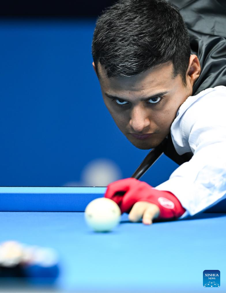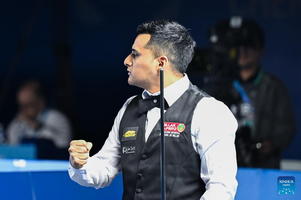 CHENGDU, 12 agosto, 2025 (Xinhua) -- Gerson Martínez, de Perú, compite durante el partido de cuartos de final de pool masculino de billar entre Gerson Martínez, de Perú, y Dang Jinhu, de China, en los Juegos Mundiales 2025, en Chengdu, en la provincia de Sichuan, en el suroeste de China, el 12 de agosto de 2025. (Xinhua/Du Zixuan)