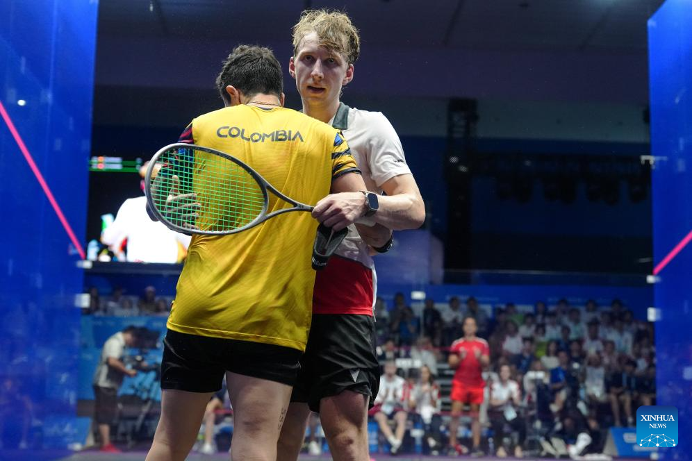 CHENGDU, 12 agosto, 2025 (Xinhua) -- Miguel Rodríguez (i) compite durante el partido por la medalla de bronce de las finales individuales masculinos entre Miguel Rodríguez, de Colombia, y Dimitri Steinmann, de Suiza, del evento de squash de los Juegos Mundiales 2025, en Chengdu, en la provincia de Sichuan, en el suroeste de China, el 12 de agosto de 2025. (Xinhua/Li Xulun)