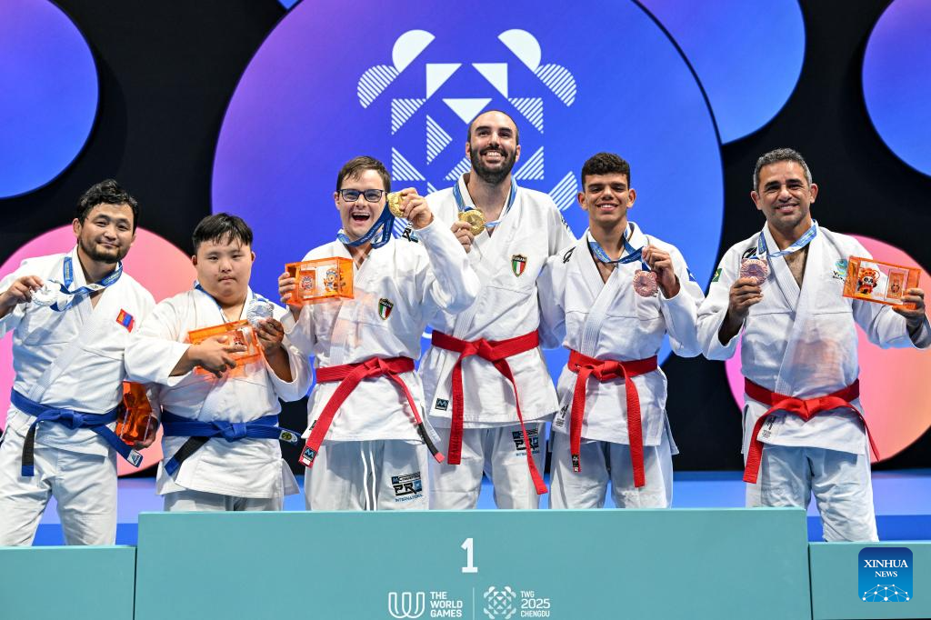 CHENGDU, 12 agosto, 2025 (Xinhua) -- Los medallistas de oro, Pietro Napoli (3-i)/Giovanni Napoli (3-d) de Italia, los medallistas de plata, Olonbayar Lkhaasuren (i)/Ulziibat Ganganmurun (2-i), de Mongolia, y los medallistas de bronce, Marcus Madruga (2-d)/Mario Edson Oliveira Silva, de Brasil, posan durante la ceremonia de premiación de dúo mixto paramental del evento de Jiu-Jitsu, en los Juegos Mundiales 2025, en Chengdu, en la provincia de Sichuan, en el suroeste de China, el 12 de agosto de 2025. (Xinhua/Feng Kaihua)