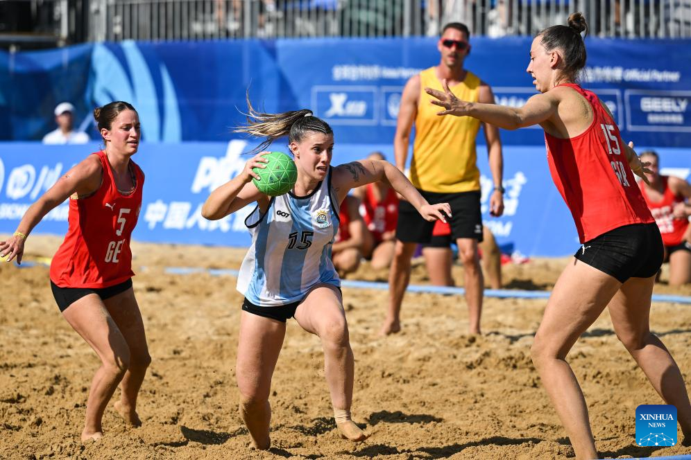 CHENGDU, 12 agosto, 2025 (Xinhua) -- Florencia Gallo (2-i), de Argentina, compite durante la final femenina por la medalla de oro del evento de balonmano de playa entre Argentina y Alemania en los Juegos Mundiales 2025, en Chengdu, en la provincia de Sichuan, en el suroeste de China, el 12 de agosto de 2025. (Xinhua/Chen Zhenhai)