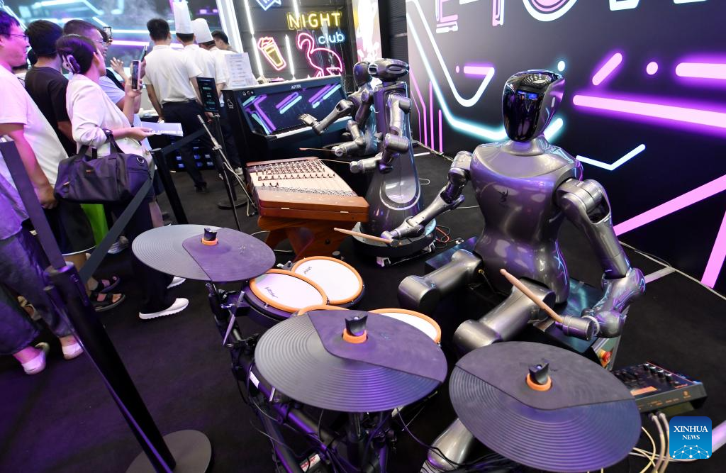 BEIJING, 12 agosto, 2025 (Xinhua) -- Imagen del 8 de agosto de 2025 de una banda de robots exhibida en la Conferencia Mundial de Robots (WRC, por sus siglas en inglés) 2025, en Beijing, capital de China. La WRC 2025 muestra la tecnología de inteligencia incorporada que avanza rápidamente, con los robots humanoides como protagonistas, demostrando un progreso significativo logrado a nivel mundial y particularmente en China, mientras que el evento también sirve para ilustrar una amplia gama de posibles aplicaciones comerciales futuras. (Xinhua/Li Xin)
