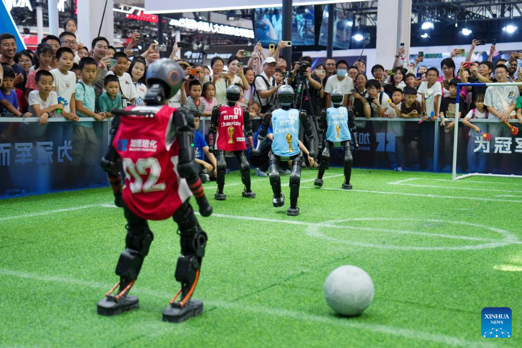 BEIJING, 12 agosto, 2025 (Xinhua) -- Imagen del 11 de agosto de 2025 de robots humanoides jugando fútbol en el estand de Booster Robotics durante la Conferencia Mundial de Robots (WRC, por sus siglas en inglés) 2025, en Beijing, capital de China. La WRC 2025 muestra la tecnología de inteligencia incorporada que avanza rápidamente, con los robots humanoides como protagonistas, demostrando un progreso significativo logrado a nivel mundial y particularmente en China, mientras que el evento también sirve para ilustrar una amplia gama de posibles aplicaciones comerciales futuras. (Xinhua/Ju Huanzong)