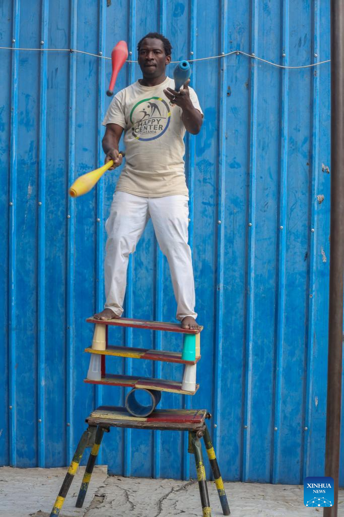 DAR ES SALAAM, 13 agosto, 2025 (Xinhua) -- Imagen del 11 de agosto de 2025 de un estudiante realizando malabarismos con mazas mientras se balancea sobre accesorios apilados durante una sesión de entrenamiento de acrobacias, en Dar es Salaam, Tanzania. Veinte jóvenes tanzanos viajaron a China para aprender acrobacia, lo que se convirtió en un hito en la historia de los intercambios culturales entre China y Tanzania. Desde las heladas calles de Wuhan hasta los soleados campos de entrenamiento de Dar es Salaam, la historia de las acrobacias tanzanas continúa desarrollándose. (Xinhua/Emmanuel Herman)