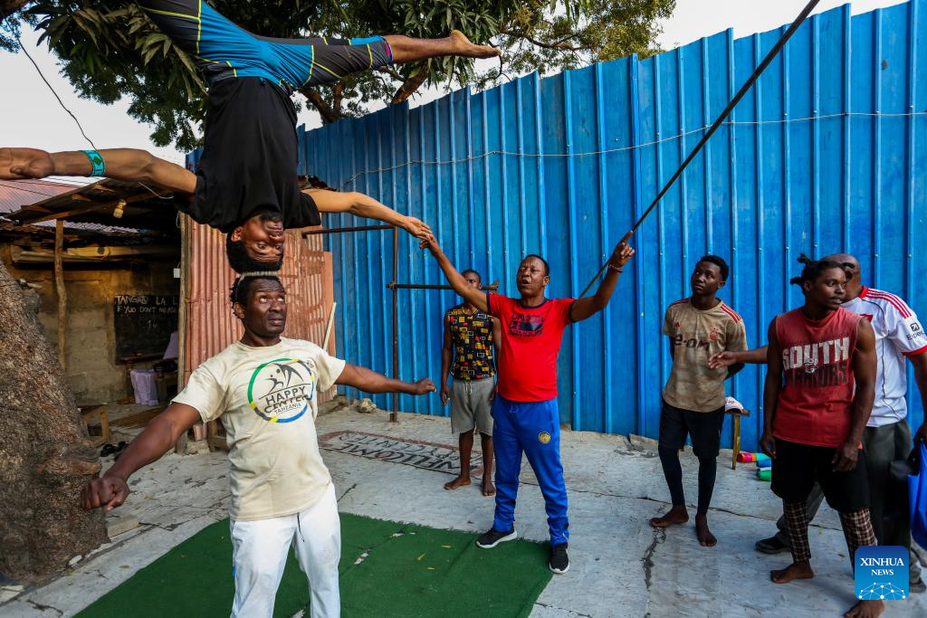 DAR ES SALAAM, 13 agosto, 2025 (Xinhua) -- Imagen del 11 de agosto de 2025 de Hamis Adam Nyota (c) instruyendo a los estudiantes durante una sesión de práctica de acrobacias, en Dar es Salaam, Tanzania. Veinte jóvenes tanzanos viajaron a China para aprender acrobacia, lo que se convirtió en un hito en la historia de los intercambios culturales entre China y Tanzania. Desde las heladas calles de Wuhan hasta los soleados campos de entrenamiento de Dar es Salaam, la historia de las acrobacias tanzanas continúa desarrollándose. (Xinhua/Emmanuel Herman)