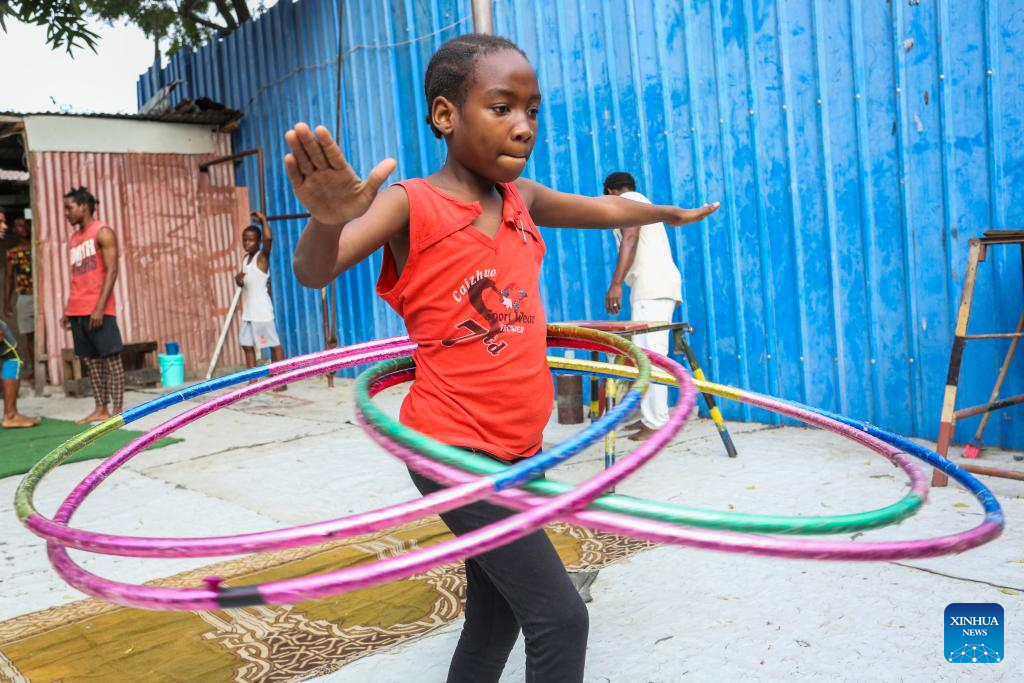 DAR ES SALAAM, 13 agosto, 2025 (Xinhua) -- Imagen del 11 de agosto de 2025 de Aisha Juma, de nueve años, practicando con aros de hula hoop durante una sesión de entrenamiento de acrobacias, en Dar es Salaam, Tanzania. Veinte jóvenes tanzanos viajaron a China para aprender acrobacia, lo que se convirtió en un hito en la historia de los intercambios culturales entre China y Tanzania. Desde las heladas calles de Wuhan hasta los soleados campos de entrenamiento de Dar es Salaam, la historia de las acrobacias tanzanas continúa desarrollándose. (Xinhua/Emmanuel Herman)