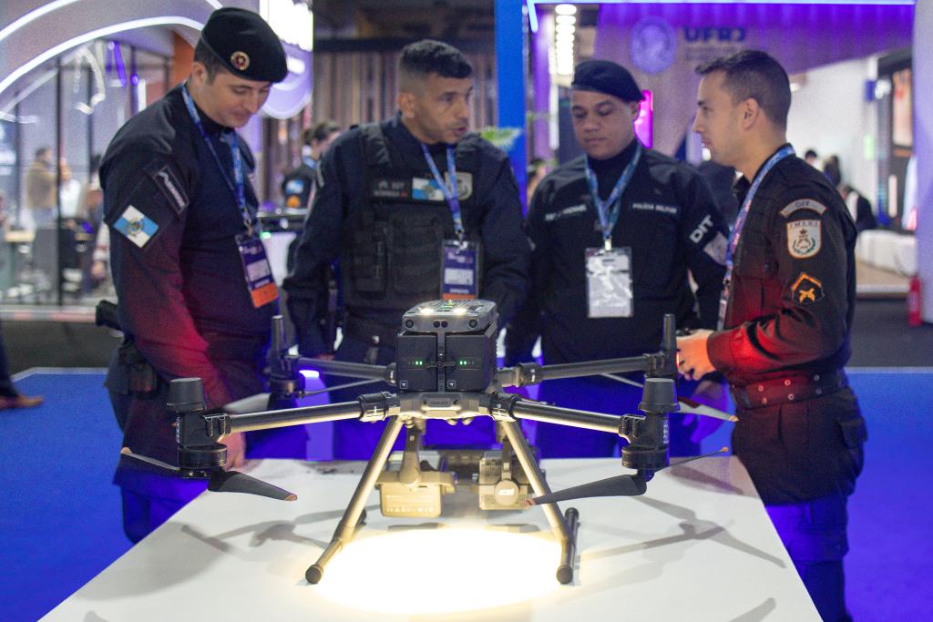 RIO DE JANEIRO, 13 agosto, 2025 (Xinhua) -- Visitantes observan un dron policía exhibido durante la Rio Innovation Week, en Río de Janeiro, Brasil, el 13 de agosto de 2025. (Xinhua/Claudia Martini)