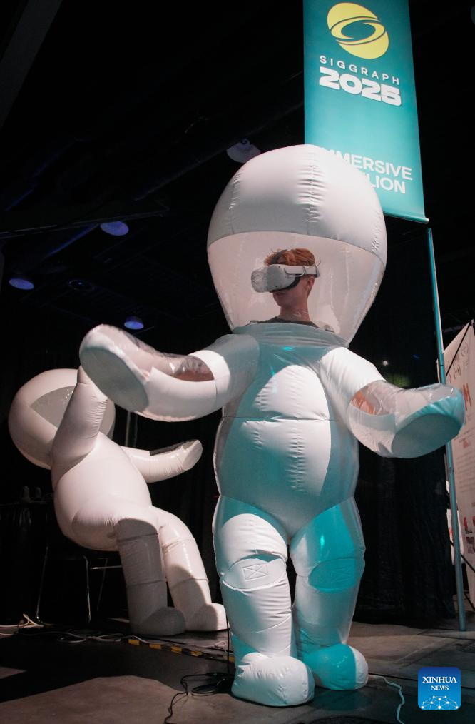 VANCOUVER, 13 agosto, 2025 (Xinhua) -- Imagen del 12 de agosto de 2025 de un visitante intentando experimentar la sensación de ser un bebé utilizando tecnología de realidad virtual y vistiendo un traje especial con membrana durante la Principal Conferencia y Exposición sobre Gráficos por Computadora y Técnicas Interactivas (SIGGRAPH 2025), en el Centro de Convenciones de Vancouver, en Vancouver, Canadá. La exposición muestra la innovación y los avances tecnológicos en gráficos por computadora, arte digital, animación, efectos visuales, nuevas realidades, inteligencia artificial, investigación y más. (Xinhua/Liang Sen)