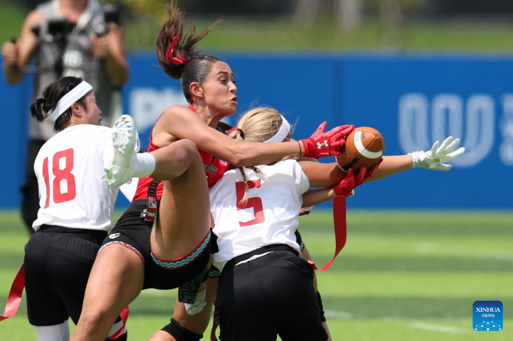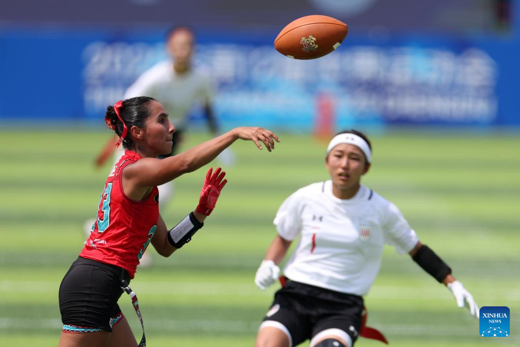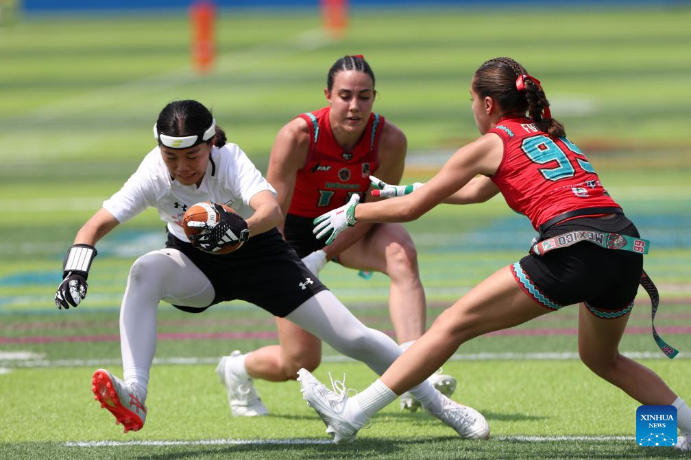 CHENGDU, 14 agosto, 2025 (Xinhua) -- Victoria Chávez (c), de México, disputa el balón con Kanatani Asahi (d), de Japón, durante el partido del grupo B de la ronda preliminar femenina de fútbol bandera entre México y Japón en los Juegos Mundiales 2025, en Chengdu, en la provincia de Sichuan, en el suroeste de China, el 14 de agosto de 2025. (Xinhua/Chen Bin)