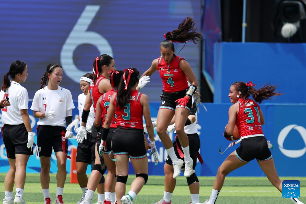 CHENGDU, 14 agosto, 2025 (Xinhua) -- Mónica Rangel (2-d), de México, festeja durante el partido del grupo B de la ronda preliminar femenina de fútbol bandera entre México y Japón en los Juegos Mundiales 2025, en Chengdu, en la provincia de Sichuan, en el suroeste de China, el 14 de agosto de 2025. (Xinhua/Chen Bin)
