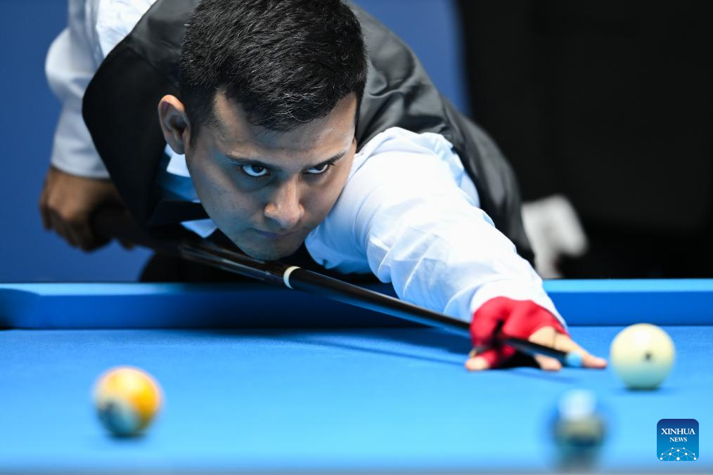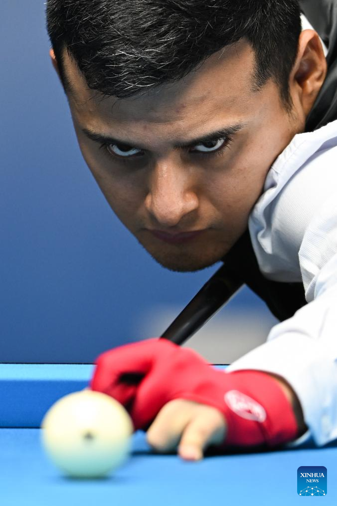 CHENGDU, 14 agosto, 2025 (Xinhua) -- Gerson Martínez, de Perú, compite durante el partido por la medalla de oro de las finales de pool masculino de billar entre Oliver Szolnoki, de Hungría, y Gerson Martínez, de Perú, en los Juegos Mundiales 2025, en Chengdu, en la provincia de Sichuan, en el suroeste de China, el 14 de agosto de 2025 (Xinhua/Du Zixuan)
