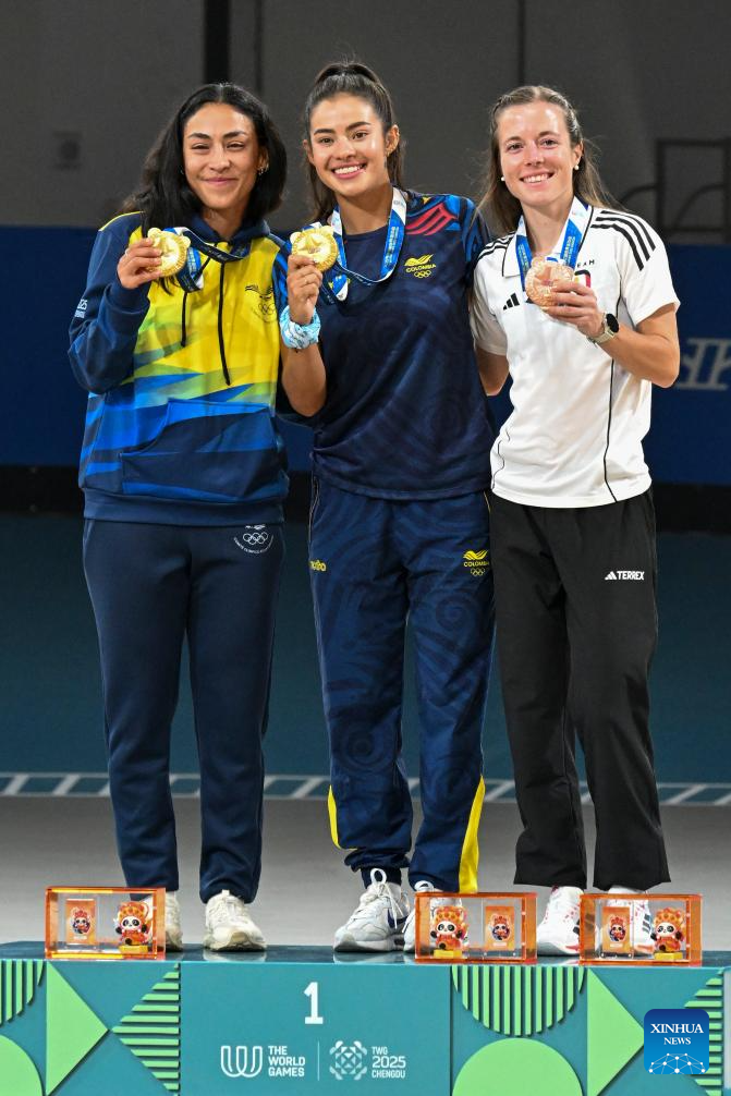 CHENGDU, 14 agosto, 2025 (Xinhua) -- Las medallistas de oro, Gabriela Rueda (c), de Colombia, y Gabriela Vargas Sarmiento (i), de Ecuador, posan con la medallista de bronce, Larissa Ursula Gaiser, de Alemania, durante la ceremonia de premiación de la carrera de 5000 m por puntos femenina de patinaje de velocidad en línea en pista, en los Juegos Mundiales 2025, en Chengdu, en la provincia de Sichuan, en el suroeste de China, el 14 de agosto de 2025. (Xinhua/Xie Jianfei)