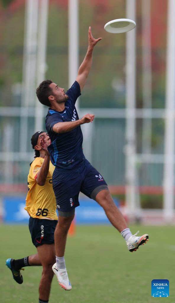 CHENGDU, 14 agosto, 2025 (Xinhua) -- Paul Benvegnen (d), de Francia, compite durante el encuentro del grupo B de la ronda preliminar mixta de disco volador entre Colombia y Francia, en los Juegos Mundiales 2025, en Chengdu, en la provincia de Sichuan, en el suroeste de China, el 14 de agosto de 2025. (Xinhua/Qiu Shaoyu)