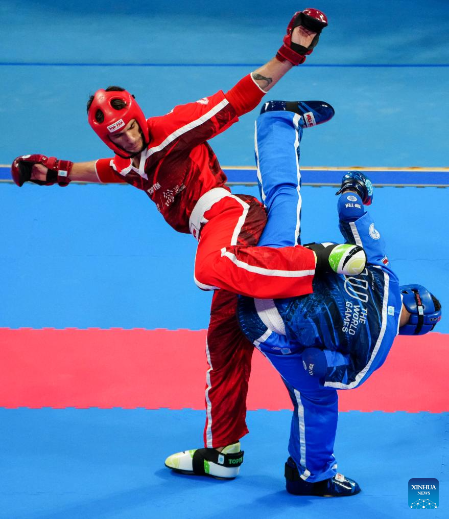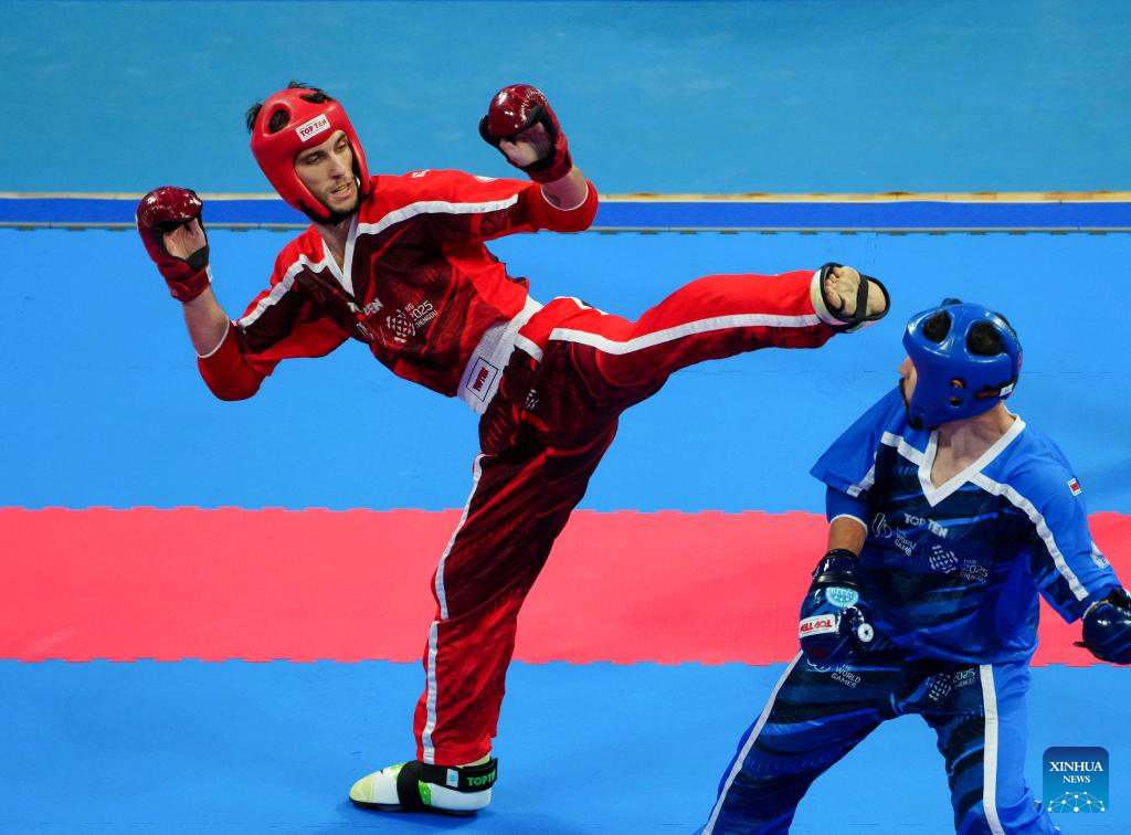 CHENGDU, 14 agosto, 2025 (Xinhua) -- Dimitrios Economo (i), de Grecia, compite ante Héctor Solorio, de México, en el combate final por la medalla de oro masculinos por puntos -84 kg de kickboxing en los Juegos Mundiales 2025, en Chengdu, en la provincia de Sichuan, en el suroeste de China, el 14 de agosto de 2025. (Xinhua/Chen Xinbo)