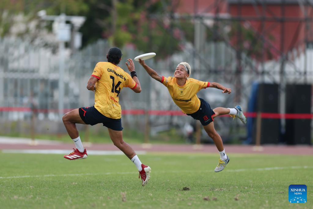 CHENGDU, 14 agosto, 2025 (Xinhua) -- Manuela Cardenas (d), de Colombia, compite durante el encuentro del grupo B de la ronda preliminar mixta de disco volador entre Colombia y Francia, en los Juegos Mundiales 2025, en Chengdu, en la provincia de Sichuan, en el suroeste de China, el 14 de agosto de 2025. (Xinhua/Qiu Shaoyu)