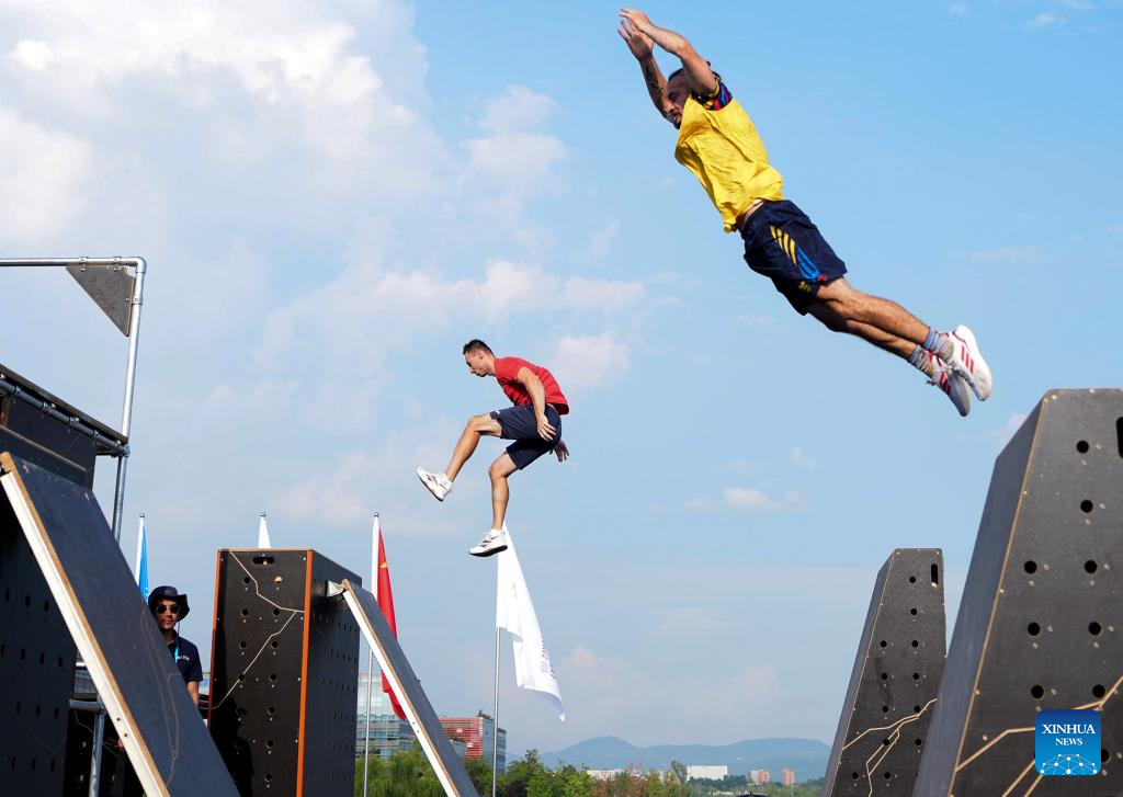 CHENGDU, 14 agosto, 2025 (Xinhua) -- Imagen del 13 de agosto de 2025 de Jaroslav Chum (i), de República Checa, y Carlos Peña, de Colombia, compitiendo durante la final masculina de velocidad del evento de parkour, en los Juegos Mundiales 2025, en Chengdu, en la provincia de Sichuan, en el suroeste de China. (Xinhua/Li Jianan)